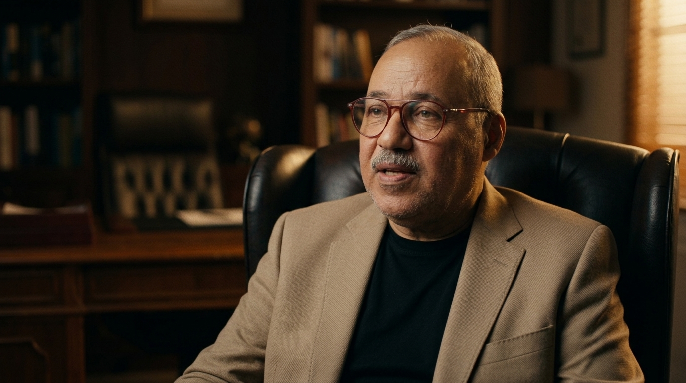 Strong rule: style --- Realistic cinematic talking head ---. A middle-aged Egyptian man with a kind face, short salt-and-pepper hair, and a well-groomed dark mustache. He wears a professional beige blazer over a crisp black button-down shirt. He has warm brown eyes and a sincere smile. He is seated in a high-back, dark brown tufted leather executive chair. The lighting is soft and cinematic, highlighting the realistic skin textures, fine lines around the eyes, and the fabric of his blazer. The background is dark and out of focus, creating a professional and elegant atmosphere in an Egyptian office setting.