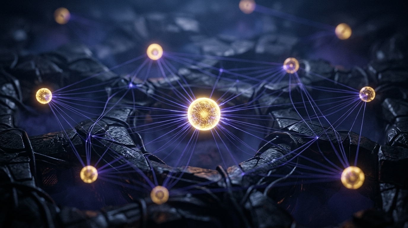 Art style: Премиальный мистико-научный кинематографичный м.... Абстрактная сцена. Центральная золотая точка (символ "Я") окружена несколькими другими. Между центральной точкой и остальными протягиваются едва заметные нити энергии индиго, создавая тот же самый узнаваемый паттерн напряжения, что и в предыдущих сценах. ━━━━━━━━━━━━━━━━━━━━━━━━━━━━━━━━━━━━━━ FINAL STYLE ENFORCEMENT (this is the authoritative rendering directive — it overrides any style wording elsewhere in the prompt): Render this image entirely in "Премиальный мистико-научный кинематографичный м..." style. Match the lighting grammar, material response, colour science, level of realism / stylisation, line weight, and shading model typical of "Премиальный мистико-научный кинематографичный м...". Keep the subject, composition, camera angle, lighting direction, and colour palette from the description above — but EVERY surface, skin, fabric, material, and environmental element must be rendered in the "Премиальный мистико-научный кинематографичный м..." idiom, not in any other medium.