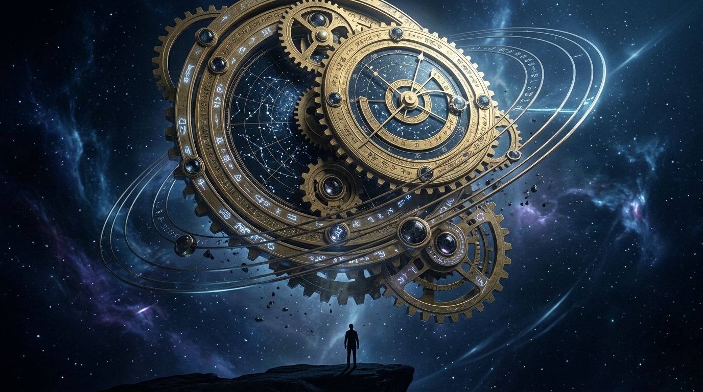 Art style: Премиальный мистико-научный кинематографичный м.... Символическая сцена. Огромный, сложный механизм, похожий на золотые часы или астролябию, медленно вращается в космической глубине. Внизу кадра — крошечный, едва заметный силуэт, смотрящий вверх на этот вселенский механизм. Ощущение предопределенности и беспомощности. ━━━━━━━━━━━━━━━━━━━━━━━━━━━━━━━━━━━━━━ FINAL STYLE ENFORCEMENT (this is the authoritative rendering directive — it overrides any style wording elsewhere in the prompt): Render this image entirely in "Премиальный мистико-научный кинематографичный м..." style. Match the lighting grammar, material response, colour science, level of realism / stylisation, line weight, and shading model typical of "Премиальный мистико-научный кинематографичный м...". Keep the subject, composition, camera angle, lighting direction, and colour palette from the description above — but EVERY surface, skin, fabric, material, and environmental element must be rendered in the "Премиальный мистико-научный кинематографичный м..." idiom, not in any other medium.