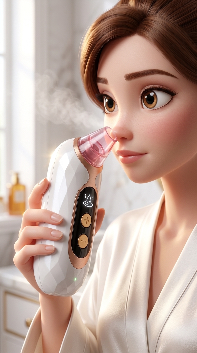 Art style: 3D Pixar. Крупный план изящной руки, держащей стильный эргономичный вакуумный очиститель. Белый глянцевый корпус с гранями, как у кристалла, и деталями из матового розового золота. Сверху установлена прозрачная коническая насадка из пластика с легким розовым оттенком и мягким силиконовым наконечником. На корпусе — черный OLED-дисплей со светящимися иконками. Прибор поднесен к коже лица в области носа, не делай его слишком большим. Вокруг витает легкий пар, создавая эффект спа-процедуры. Освещение яркое, сфокусированное на устройстве, создающее блики на его гладкой поверхности. Атмосфера технологичности и чистоты. Доминирующие цвета золотистого и белого ━━━━━━━━━━━━━━━━━━━━━━━━━━━━━━━━━━━━━━ FINAL STYLE ENFORCEMENT (this is the authoritative rendering directive — it overrides any style wording elsewhere in the prompt): Render this image entirely in "3D Pixar" style. Match the lighting grammar, material response, colour science, level of realism / stylisation, line weight, and shading model typical of "3D Pixar". Keep the subject, composition, camera angle, lighting direction, and colour palette from the description above — but EVERY surface, skin, fabric, material, and environmental element must be rendered in the "3D Pixar" idiom, not in any other medium. Character appearance reference (MUST match exactly): - Анна: Strong rule: style --- 3D Pixar ---. Портрет молодой женщины около двадцати пяти лет с утонченными чертами лица и выразительными карими глазами. У нее гладкие, блестящие каштановые волосы, аккуратно собранные в высокий пучок, открывающий шею. Она одета в элегантный домашний халат из белого натурального шелка. Девушка находится в светлой ванной комнате с отделкой из белого мрамора и золотой фурнитурой. Освещение мягкое и естественное, имитирующее раннее утро, создающее свежий и чистый вид. В ее облике сочетаются естественная красота и стремление к идеальному уходу. Стиль — детальная фотография с мягким фокусом на заднем плане. - Вакуумный аппарат: Strong rule: style --- 3D Pixar ---. Белый корпус, наконечник насадка розовый, посередине спереди чёрный овал на нём кнопки две золотистые