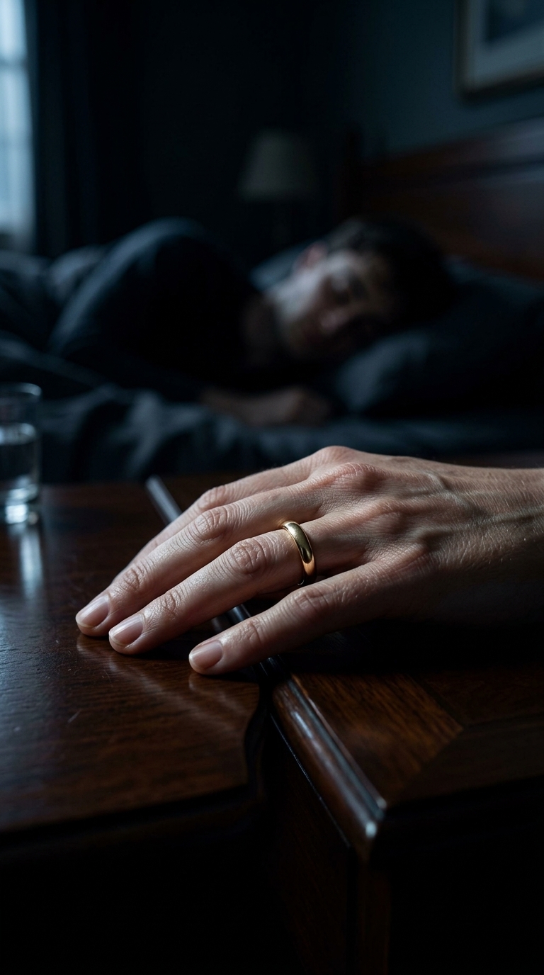 Art style: Cinematic Realism. Extreme close-up on Hermione's hand as she slowly twists her golden wedding ring. Her hand is resting on a dark, polished wooden nightstand next to the bed. In the background, the bedroom is dark, and the shape of Harry sleeping is barely visible. Moonlight streams from a window, catching the gold of the ring and the fine lines on her hand. Dramatic, intimate, shallow depth of field. ━━━━━━━━━━━━━━━━━━━━━━━━━━━━━━━━━━━━━━ FINAL STYLE ENFORCEMENT (this is the authoritative rendering directive — it overrides any style wording elsewhere in the prompt): Render this image entirely in "Cinematic Realism" style. Match the lighting grammar, material response, colour science, level of realism / stylisation, line weight, and shading model typical of "Cinematic Realism". Keep the subject, composition, camera angle, lighting direction, and colour palette from the description above — but EVERY surface, skin, fabric, material, and environmental element must be rendered in the "Cinematic Realism" idiom, not in any other medium. Character appearance reference (MUST match exactly): - Гермиона Грейнджер: Strong rule: style --- Cinematic Realism ---. Adult Hermione Granger, 35 years old, based on Emma Watson. She has elegant, styled brown hair, sharp, intelligent brown eyes. Dressed in a sophisticated, high-neck dark silk gown. Her posture is perfect, her expression is a mask of cold indifference, but her eyes betray a storm of conflict and desire.