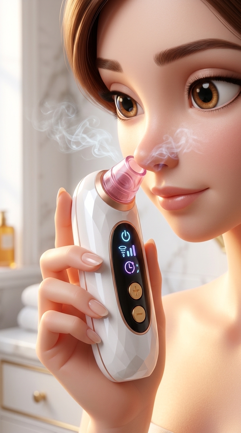 Art style: 3D Pixar. Крупный план изящной руки, держащей стильный эргономичный вакуумный очиститель. Белый глянцевый корпус с гранями, как у кристалла, и деталями из матового розового золота. Сверху установлена прозрачная коническая насадка из пластика с легким розовым оттенком и мягким силиконовым наконечником. На корпусе — черный OLED-дисплей со светящимися иконками. Прибор поднесен к коже лица в области носа, не делай его слишком большим, корпус тонкий можно отхватить двумя пальцами диаметр. Вокруг витает легкий пар, создавая эффект спа-процедуры. Освещение яркое, сфокусированное на устройстве, создающее блики на его гладкой поверхности. Атмосфера технологичности и чистоты. Доминирующие цвета золотистого и белого ━━━━━━━━━━━━━━━━━━━━━━━━━━━━━━━━━━━━━━ FINAL STYLE ENFORCEMENT (this is the authoritative rendering directive — it overrides any style wording elsewhere in the prompt): Render this image entirely in "3D Pixar" style. Match the lighting grammar, material response, colour science, level of realism / stylisation, line weight, and shading model typical of "3D Pixar". Keep the subject, composition, camera angle, lighting direction, and colour palette from the description above — but EVERY surface, skin, fabric, material, and environmental element must be rendered in the "3D Pixar" idiom, not in any other medium. Character appearance reference (MUST match exactly): - Анна: Strong rule: style --- 3D Pixar ---. Портрет молодой женщины около двадцати пяти лет с утонченными чертами лица и выразительными карими глазами. У нее гладкие, блестящие каштановые волосы, аккуратно собранные в высокий пучок, открывающий шею. Она одета в элегантный домашний халат из белого натурального шелка. Девушка находится в светлой ванной комнате с отделкой из белого мрамора и золотой фурнитурой. Освещение мягкое и естественное, имитирующее раннее утро, создающее свежий и чистый вид. В ее облике сочетаются естественная красота и стремление к идеальному уходу. Стиль — детальная фотография с мягким фокусом на заднем плане. - Вакуумный аппарат: Strong rule: style --- 3D Pixar ---. Белый корпус, наконечник насадка розовый, посередине спереди чёрный овал на нём кнопки две золотистые