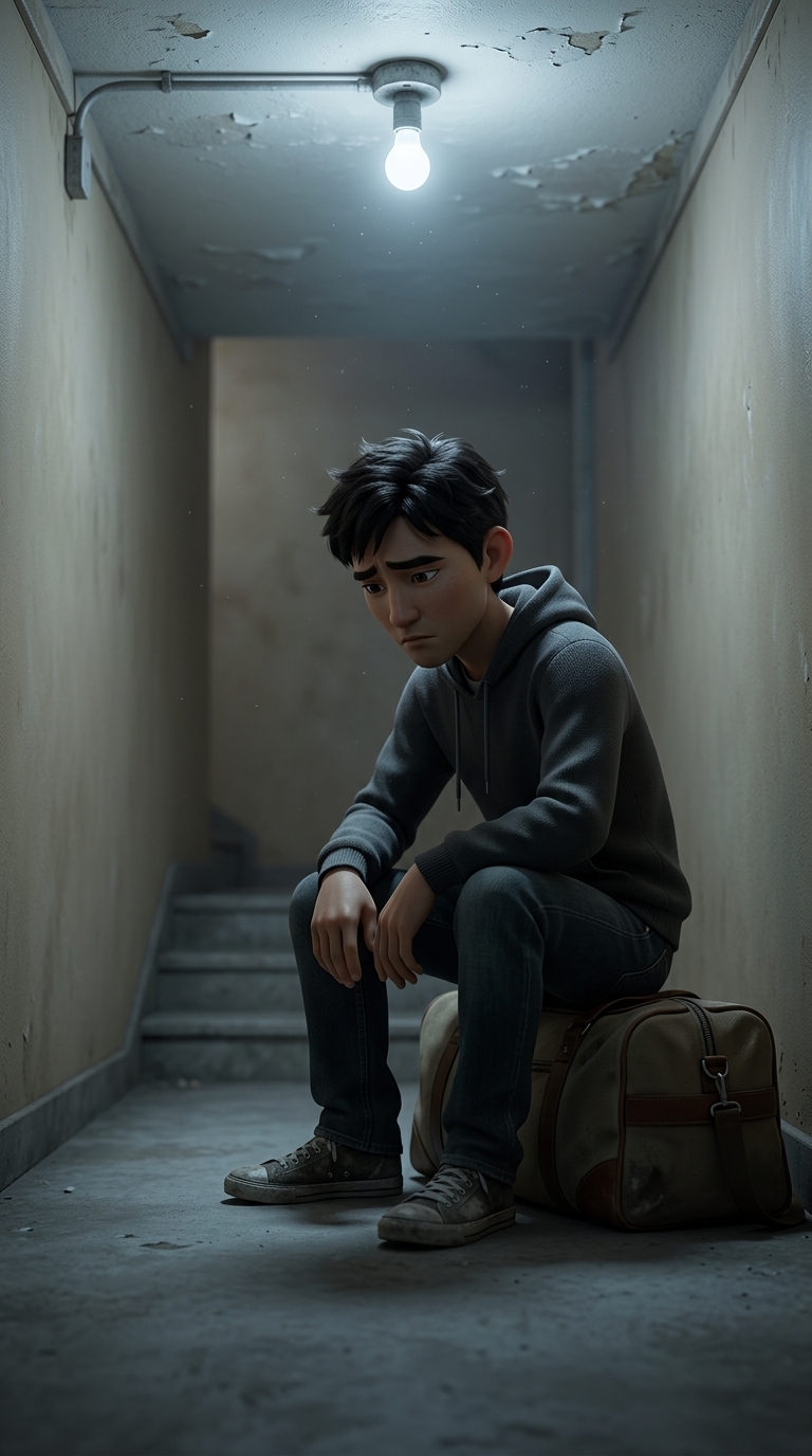 Art style: 3D Pixar. Эрес сидит на своей сумке в тускло освещенном, безликом подъезде. Он смотрит в пол, на его лице грусть и разочарование. Свет от лампочки над ним тусклый и холодный. ━━━━━━━━━━━━━━━━━━━━━━━━━━━━━━━━━━━━━━ FINAL STYLE ENFORCEMENT (this is the authoritative rendering directive — it overrides any style wording elsewhere in the prompt): Render this image entirely in "3D Pixar" style. Match the lighting grammar, material response, colour science, level of realism / stylisation, line weight, and shading model typical of "3D Pixar". Keep the subject, composition, camera angle, lighting direction, and colour palette from the description above — but EVERY surface, skin, fabric, material, and environmental element must be rendered in the "3D Pixar" idiom, not in any other medium. Character appearance reference (MUST match exactly): - Эрес: Молодой парень, 20-22 года, азиатской (тувинской) внешности. У него темные волосы, карие глаза, стройное телосложение. Одет в современную молодежную одежду: худи, джинсы, кроссовки. Выражение лица меняется от восторженного до растерянного и грустного. Reference images context (match the visual style and elements from these): - Молодой человек в стиле 3D-анимации (character): Крупный план молодого человека с темными волосами и густыми бровями, выполненный в стиле современной 3D-анимации. Он одет в традиционную одежду с высоким воротником, а на заднем плане видны комнатные растения в теплом, мягком освещении. - Персонаж Эрес после проигрыша (character): Молодой человек с темными волосами и каплями пота на лбу, выражающий разочарование. На заднем плане виден монитор с красной надписью «GAME OVER», выполненный в стиле современной 3D-анимации.