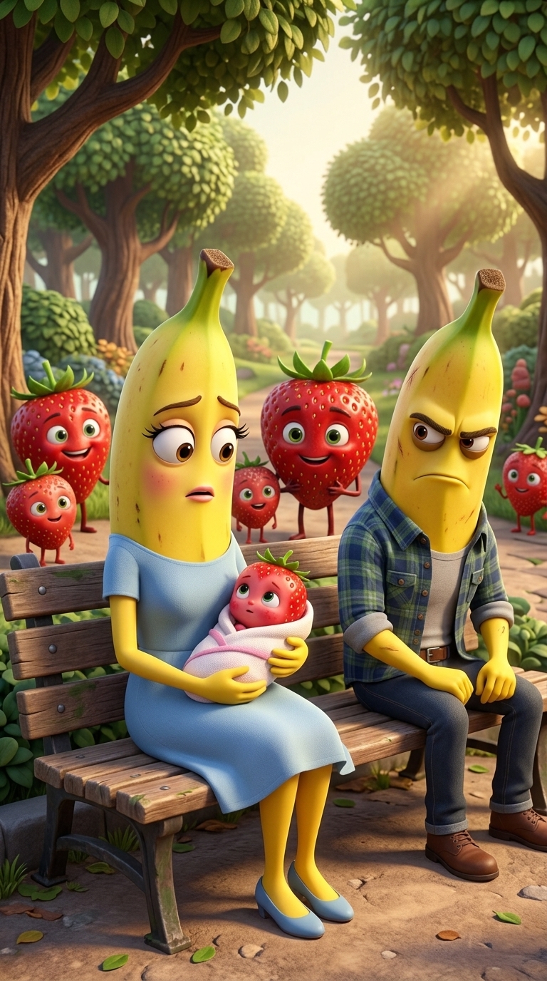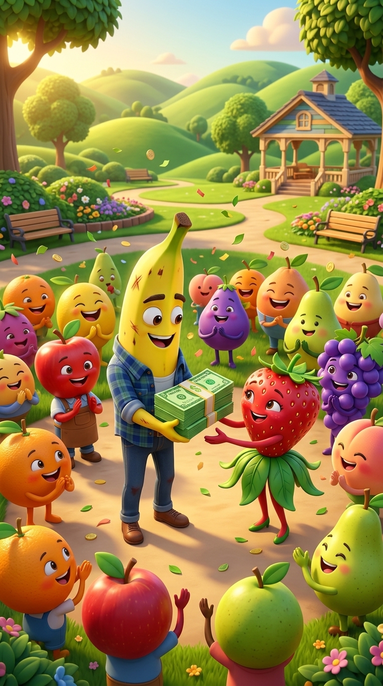 Art style: 3D Pixar animation. Солнечный день в красивом парке. Бен радостно вручает пачки денег клубничной даме Толпа других фруктов («соседей») собралась вокруг, ликуя и аплодируя. ━━━━━━━━━━━━━━━━━━━━━━━━━━━━━━━━━━━━━━ FINAL STYLE ENFORCEMENT (this is the authoritative rendering directive — it overrides any style wording elsewhere in the prompt): Render this image entirely in "3D Pixar animation" style. Match the lighting grammar, material response, colour science, level of realism / stylisation, line weight, and shading model typical of "3D Pixar animation". Keep the subject, composition, camera angle, lighting direction, and colour palette from the description above — but EVERY surface, skin, fabric, material, and environmental element must be rendered in the "3D Pixar animation" idiom, not in any other medium. Character appearance reference (MUST match exactly): - Ben (The Husband): Strong rule: style --- 3D Pixar animation ---. An anthropomorphic male banana, expressive face, wearing a blue plaid shirt and dark pants. He has an angry and suspicious expression for most of the story. Reference images context (match the visual style and elements from these): - Hospital Delivery Room (general): A 3D Pixar-style hospital delivery room interior. Features soft rounded walls, pastel medical equipment, and large windows with soft morning light. The design is clean, friendly, and stylized for fruit-shaped characters. High detail, cinematic 3D render, square format. - DNA Test Report (general): A 3D Pixar-style DNA test result document. A crisp white paper with 'DNA RESULTS' printed at the top in a bold font, featuring colorful genetic bar charts, a red wax seal, and official-looking signatures. Isolated on a clean surface, high detail, 3D render, square format. - High-Tech Hospital Bed (general): A 3D Pixar-style medical hospital bed. Features a sleek, rounded white plastic frame, adjustable side rails, and plush white bedding. The design is stylized and friendly, specifically built for a banana character. Isolated on a clean background, high detail, 3D render, square format. - Medical Vital Monitor (general): A 3D Pixar-style medical monitor on a rolling stand. A glowing screen displaying stylized heart rate lines and health icons in vibrant greens and blues. Features rounded corners and a sleek, modern, friendly design. Isolated on a clean background, high detail, 3D render, square format. - Suburban Home Environment (general): A 3D Pixar-style suburban house aesthetic. Features colorful wooden siding, a cozy front porch with decorative railings, and warm, inviting living spaces with soft, rounded furniture. Whimsical and charming architecture, high detail, cinematic lighting, 3D render, square format.