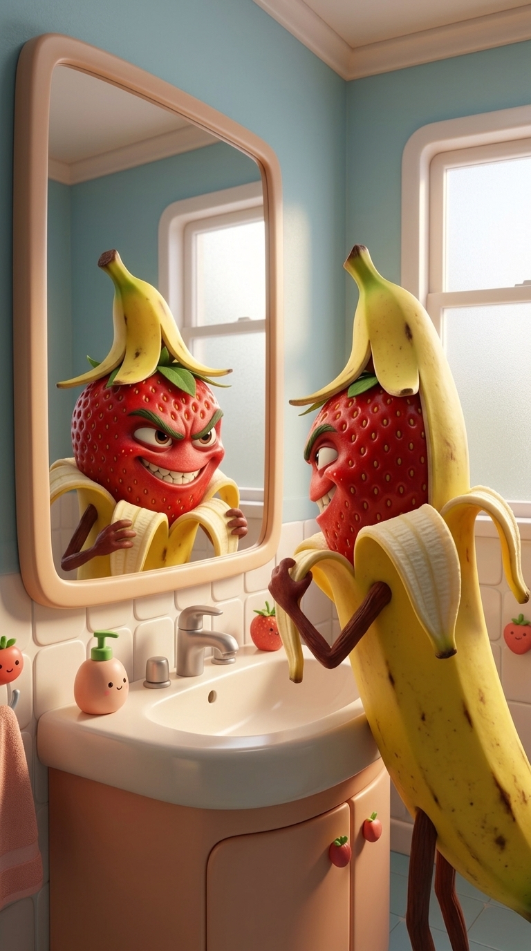 Art style: 3D Pixar animation. Ben is in a bathroom, looking at his reflection in the mirror. He has a sinister, evil grin on his face. He slowly peels back the top of his banana 'skin', revealing that his head is actually a strawberry underneath. Style: 3D Pixar animation. ━━━━━━━━━━━━━━━━━━━━━━━━━━━━━━━━━━━━━━ FINAL STYLE ENFORCEMENT (this is the authoritative rendering directive — it overrides any style wording elsewhere in the prompt): Render this image entirely in "3D Pixar animation" style. Match the lighting grammar, material response, colour science, level of realism / stylisation, line weight, and shading model typical of "3D Pixar animation". Keep the subject, composition, camera angle, lighting direction, and colour palette from the description above — but EVERY surface, skin, fabric, material, and environmental element must be rendered in the "3D Pixar animation" idiom, not in any other medium. Character appearance reference (MUST match exactly): - The Scammer: Strong rule: style --- 3D Pixar animation ---. The true form of Ben. An anthropomorphic strawberry with a sly, evil grin, wearing a banana peel as a costume. Reference images context (match the visual style and elements from these): - Hospital Delivery Room (general): A 3D Pixar-style hospital delivery room interior. Features soft rounded walls, pastel medical equipment, and large windows with soft morning light. The design is clean, friendly, and stylized for fruit-shaped characters. High detail, cinematic 3D render, square format. - DNA Test Report (general): A 3D Pixar-style DNA test result document. A crisp white paper with 'DNA RESULTS' printed at the top in a bold font, featuring colorful genetic bar charts, a red wax seal, and official-looking signatures. Isolated on a clean surface, high detail, 3D render, square format. - High-Tech Hospital Bed (general): A 3D Pixar-style medical hospital bed. Features a sleek, rounded white plastic frame, adjustable side rails, and plush white bedding. The design is stylized and friendly, specifically built for a banana character. Isolated on a clean background, high detail, 3D render, square format. - Medical Vital Monitor (general): A 3D Pixar-style medical monitor on a rolling stand. A glowing screen displaying stylized heart rate lines and health icons in vibrant greens and blues. Features rounded corners and a sleek, modern, friendly design. Isolated on a clean background, high detail, 3D render, square format. - Suburban Home Environment (general): A 3D Pixar-style suburban house aesthetic. Features colorful wooden siding, a cozy front porch with decorative railings, and warm, inviting living spaces with soft, rounded furniture. Whimsical and charming architecture, high detail, cinematic lighting, 3D render, square format.