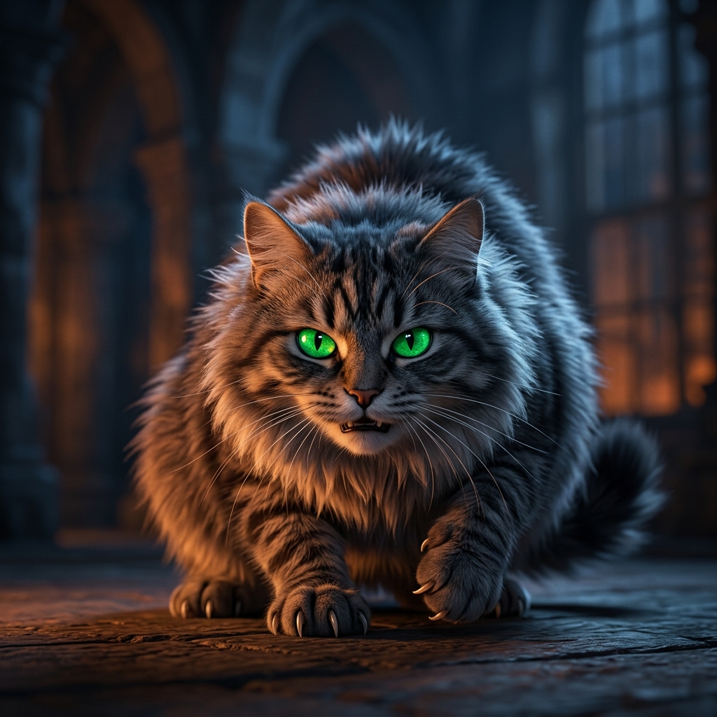 Strong rule: style --- 3D Pixar ---. Огромный, невероятно пушистый сибирский кот серо-полосатого окраса с густой гривой вокруг шеи. Глаза ярко-зеленые, светящиеся в темноте свирепым, пронзительным светом. Шерсть густая, местами всклокоченная, создающая силуэт грозного хищника. Кот сидит в угрожающей позе, его лапы огромны, с выпущенными острыми когтями. Освещение снизу вверх, создающее зловещие тени на морде, контрастный контровой свет выделяет каждый волосок на фоне тьмы. Фон представляет собой размытые очертания гигантской комнаты в глубоких синих и оранжевых тонах. Вертикальный формат, эпический масштаб, фокус на глазах и текстуре меха, атмосфера нависающей угрозы.