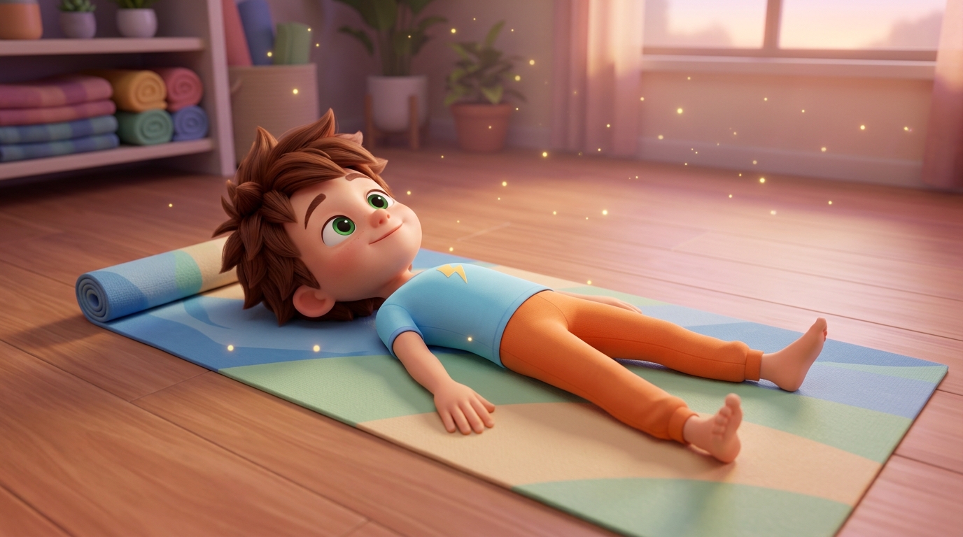 Art style: Vibrant 3D animation, soft studio lighting, pastel gradients, cute stylized characters, high-quality textures, 4K, whimsical atmosphere, floating magical particles.. A calm, welcoming studio space with a colourful yoga mat unrolled on the floor. Leo lies flat on his back on the mat, looking completely relaxed and relieved. His chest lowers as he exhales, and a satisfied, accomplished smile rests on his face. High-angle medium shot looking down at the mat. Gentle, warm, fading lighting. Peaceful and restful atmosphere. Dominant colours are tranquil blue, soft green, and warm beige. ━━━━━━━━━━━━━━━━━━━━━━━━━━━━━━━━━━━━━━ FINAL STYLE ENFORCEMENT (this is the authoritative rendering directive — it overrides any style wording elsewhere in the prompt): Render this image entirely in "Vibrant 3D animation, soft studio lighting, pastel gradients, cute stylized characters, high-quality textures, 4K, whimsical atmosphere, floating magical particles." style. Match the lighting grammar, material response, colour science, level of realism / stylisation, line weight, and shading model typical of "Vibrant 3D animation, soft studio lighting, pastel gradients, cute stylized characters, high-quality textures, 4K, whimsical atmosphere, floating magical particles.". Keep the subject, composition, camera angle, lighting direction, and colour palette from the description above — but EVERY surface, skin, fabric, material, and environmental element must be rendered in the "Vibrant 3D animation, soft studio lighting, pastel gradients, cute stylized characters, high-quality textures, 4K, whimsical atmosphere, floating magical particles." idiom, not in any other medium. Character appearance reference (MUST match exactly): - Leo: A vibrant 3D animated 7-year-old boy with a cheerful, energetic demeanour. He has messy, spiky chestnut-brown hair and large, expressive emerald-green eyes that sparkle with enthusiasm. He wears a bright, pastel-blue fitted t-shirt with a subtle yellow lightning bolt emblem on the chest, paired with comfortable, stretchy orange yoga trousers and no shoes. His posture is dynamic and heroic. The setting features soft studio lighting with a warm, whimsical atmosphere, pastel gradients, and floating magical golden particles in the background. High-quality textures, 4K resolution, cute stylised aesthetic reminiscent of modern premium animated feature films.