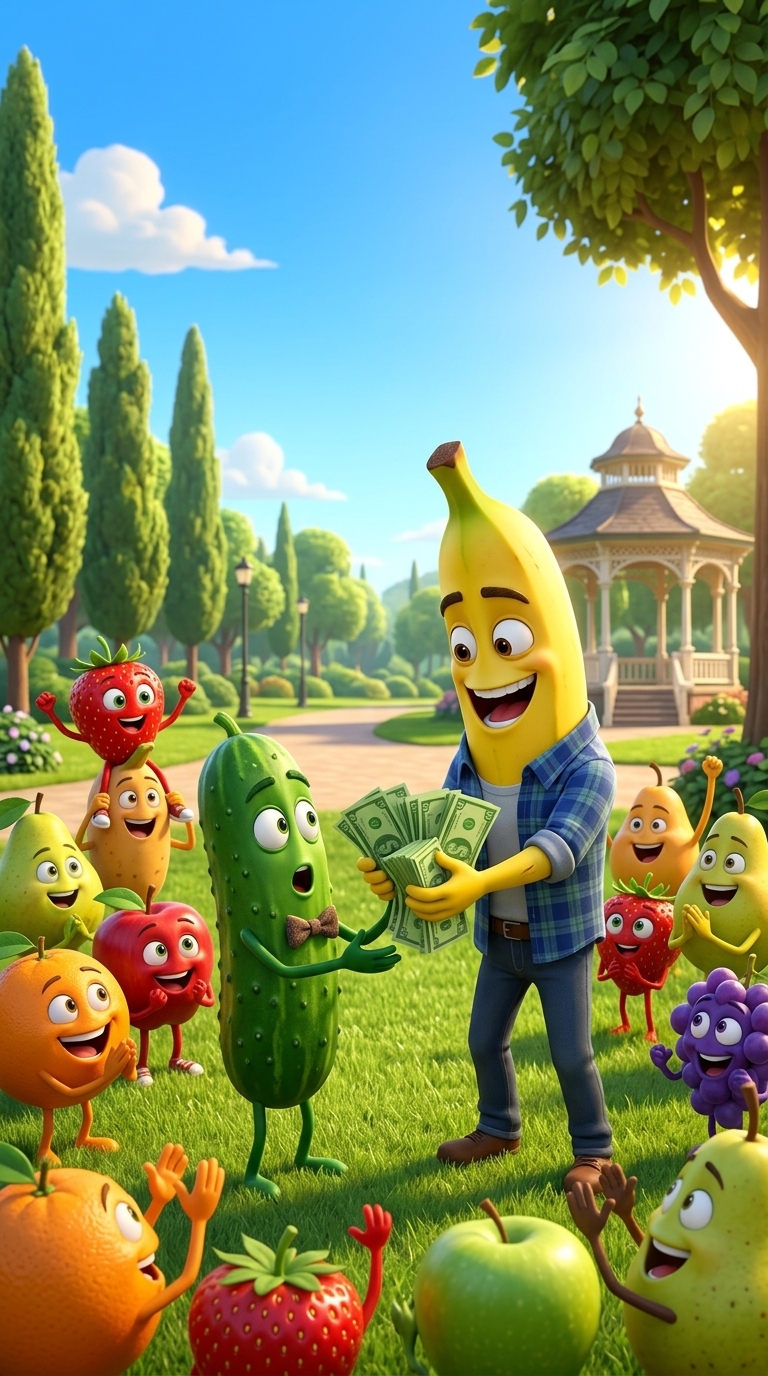 Art style: 3D Pixar animation. Солнечный день в красивом парке. Бен радостно вручает пачки денег антропоморфному огурцу Толпа других фруктов («соседей») собралась вокруг, ликуя и аплодируя. ━━━━━━━━━━━━━━━━━━━━━━━━━━━━━━━━━━━━━━ FINAL STYLE ENFORCEMENT (this is the authoritative rendering directive — it overrides any style wording elsewhere in the prompt): Render this image entirely in "3D Pixar animation" style. Match the lighting grammar, material response, colour science, level of realism / stylisation, line weight, and shading model typical of "3D Pixar animation". Keep the subject, composition, camera angle, lighting direction, and colour palette from the description above — but EVERY surface, skin, fabric, material, and environmental element must be rendered in the "3D Pixar animation" idiom, not in any other medium. Character appearance reference (MUST match exactly): - Ben (The Husband): Strong rule: style --- 3D Pixar animation ---. An anthropomorphic male banana, expressive face, wearing a blue plaid shirt and dark pants. He has an angry and suspicious expression for most of the story. Reference images context (match the visual style and elements from these): - Hospital Delivery Room (general): A 3D Pixar-style hospital delivery room interior. Features soft rounded walls, pastel medical equipment, and large windows with soft morning light. The design is clean, friendly, and stylized for fruit-shaped characters. High detail, cinematic 3D render, square format. - DNA Test Report (general): A 3D Pixar-style DNA test result document. A crisp white paper with 'DNA RESULTS' printed at the top in a bold font, featuring colorful genetic bar charts, a red wax seal, and official-looking signatures. Isolated on a clean surface, high detail, 3D render, square format. - High-Tech Hospital Bed (general): A 3D Pixar-style medical hospital bed. Features a sleek, rounded white plastic frame, adjustable side rails, and plush white bedding. The design is stylized and friendly, specifically built for a banana character. Isolated on a clean background, high detail, 3D render, square format. - Medical Vital Monitor (general): A 3D Pixar-style medical monitor on a rolling stand. A glowing screen displaying stylized heart rate lines and health icons in vibrant greens and blues. Features rounded corners and a sleek, modern, friendly design. Isolated on a clean background, high detail, 3D render, square format. - Suburban Home Environment (general): A 3D Pixar-style suburban house aesthetic. Features colorful wooden siding, a cozy front porch with decorative railings, and warm, inviting living spaces with soft, rounded furniture. Whimsical and charming architecture, high detail, cinematic lighting, 3D render, square format.
