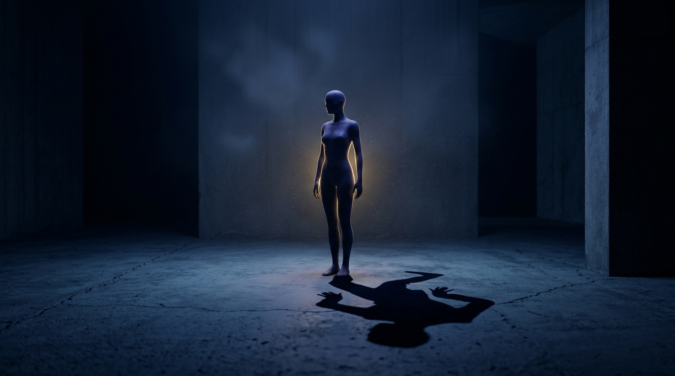 Art style: cinematic, minimalist, abstract, conceptual art. The dark shadow cast by the silhouette on the floor behind it moves with a slight delay, not perfectly in sync with the silhouette's own small movements. It has a life of its own. ━━━━━━━━━━━━━━━━━━━━━━━━━━━━━━━━━━━━━━ FINAL STYLE ENFORCEMENT (this is the authoritative rendering directive — it overrides any style wording elsewhere in the prompt): Render this image entirely in "cinematic, minimalist, abstract, conceptual art" style. Match the lighting grammar, material response, colour science, level of realism / stylisation, line weight, and shading model typical of "cinematic, minimalist, abstract, conceptual art". Keep the subject, composition, camera angle, lighting direction, and colour palette from the description above — but EVERY surface, skin, fabric, material, and environmental element must be rendered in the "cinematic, minimalist, abstract, conceptual art" idiom, not in any other medium. Character appearance reference (MUST match exactly): - Главный Силуэт: Strong rule: style --- cinematic, minimalist, abstract, conceptual art ---. An androgynous, featureless human silhouette made of deep, dark indigo material, sometimes glowing with a soft internal golden light. The form is elegant and minimalist. - Тень: Strong rule: style --- cinematic, minimalist, abstract, conceptual art ---. A shadow that is nearly identical to the Main Silhouette but slightly distorted, its movements are desynchronized. It is made of a deeper, more absorbing darkness.