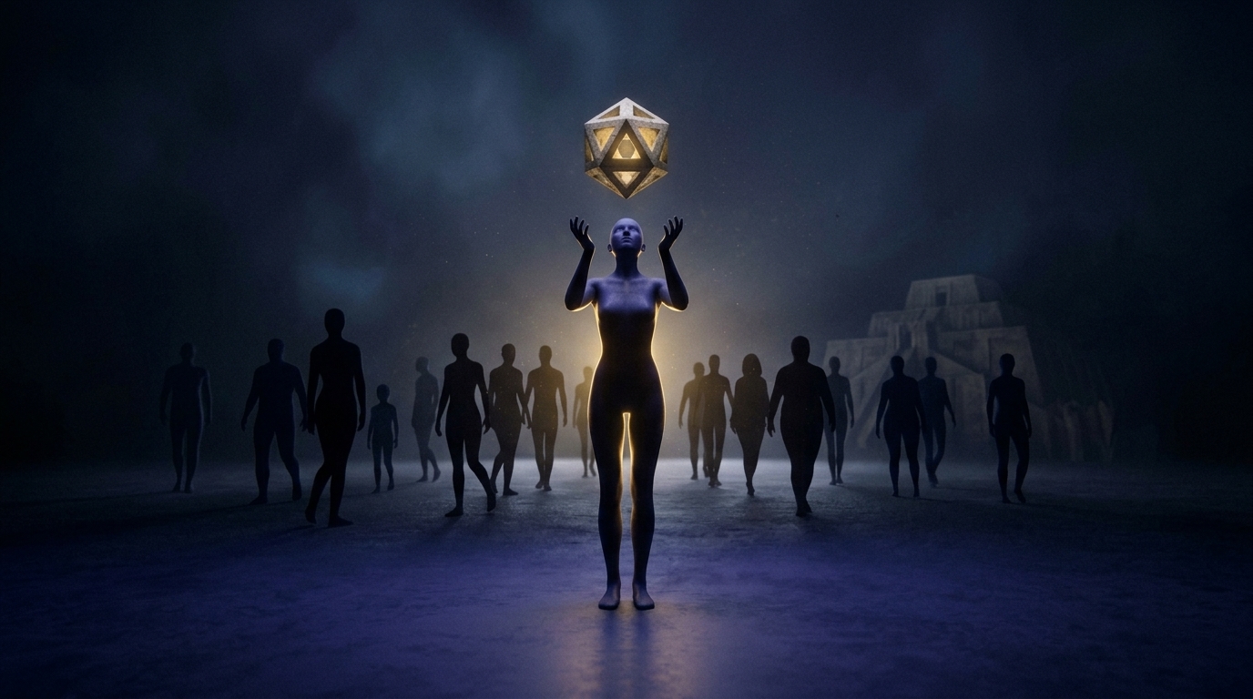 Character appearance reference (MUST match exactly): - Главный Силуэт: Strong rule: style --- cinematic, minimalist, abstract, conceptual art ---. An androgynous, featureless human silhouette made of deep, dark indigo material, sometimes glowing with a soft internal golden light. The form is elegant and minimalist. - Другие Силуэты: Strong rule: style --- cinematic, minimalist, abstract, conceptual art ---. Featureless human silhouettes of varying shapes and sizes, made of dark indigo or shadowy material. They are minimalist and symbolic.