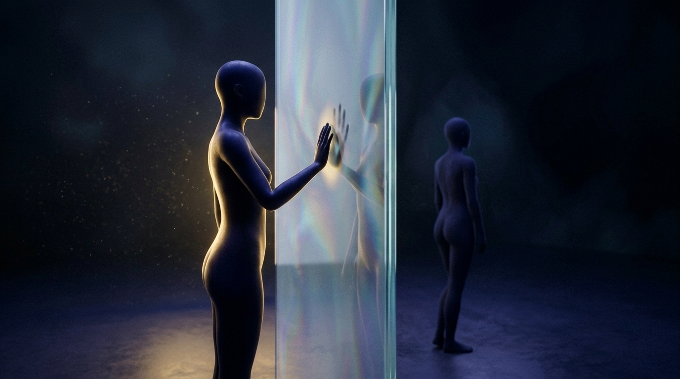 Art style: cinematic, minimalist, abstract, conceptual art. An emotionally unavailable silhouette stands behind a pane of clear, shimmering glass. The main silhouette is on the other side, its hand resting on the glass, trying to connect. ━━━━━━━━━━━━━━━━━━━━━━━━━━━━━━━━━━━━━━ FINAL STYLE ENFORCEMENT (this is the authoritative rendering directive — it overrides any style wording elsewhere in the prompt): Render this image entirely in "cinematic, minimalist, abstract, conceptual art" style. Match the lighting grammar, material response, colour science, level of realism / stylisation, line weight, and shading model typical of "cinematic, minimalist, abstract, conceptual art". Keep the subject, composition, camera angle, lighting direction, and colour palette from the description above — but EVERY surface, skin, fabric, material, and environmental element must be rendered in the "cinematic, minimalist, abstract, conceptual art" idiom, not in any other medium. Character appearance reference (MUST match exactly): - Главный Силуэт: Strong rule: style --- cinematic, minimalist, abstract, conceptual art ---. An androgynous, featureless human silhouette made of deep, dark indigo material, sometimes glowing with a soft internal golden light. The form is elegant and minimalist. - Другие Силуэты: Strong rule: style --- cinematic, minimalist, abstract, conceptual art ---. Featureless human silhouettes of varying shapes and sizes, made of dark indigo or shadowy material. They are minimalist and symbolic.