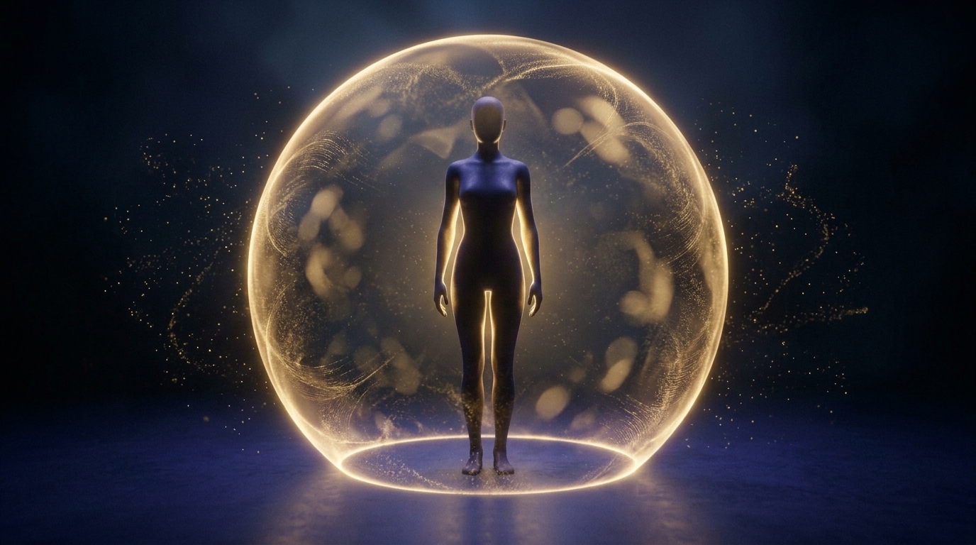 Art style: cinematic, minimalist, abstract, conceptual art. A soft, glowing golden boundary of light appears around the main silhouette, forming a protective circle or bubble. It's gentle but firm. ━━━━━━━━━━━━━━━━━━━━━━━━━━━━━━━━━━━━━━ FINAL STYLE ENFORCEMENT (this is the authoritative rendering directive — it overrides any style wording elsewhere in the prompt): Render this image entirely in "cinematic, minimalist, abstract, conceptual art" style. Match the lighting grammar, material response, colour science, level of realism / stylisation, line weight, and shading model typical of "cinematic, minimalist, abstract, conceptual art". Keep the subject, composition, camera angle, lighting direction, and colour palette from the description above — but EVERY surface, skin, fabric, material, and environmental element must be rendered in the "cinematic, minimalist, abstract, conceptual art" idiom, not in any other medium. Character appearance reference (MUST match exactly): - Главный Силуэт: Strong rule: style --- cinematic, minimalist, abstract, conceptual art ---. An androgynous, featureless human silhouette made of deep, dark indigo material, sometimes glowing with a soft internal golden light. The form is elegant and minimalist.