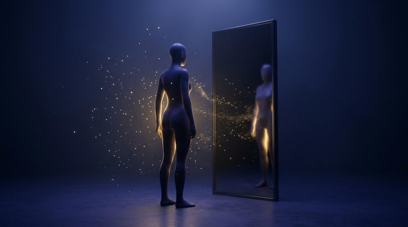 Art style: cinematic, minimalist, abstract, conceptual art. The silhouette stands before a large, dark, polished mirror in a silent space. The air is filled with gently floating golden dust. The scene is calm but charged with anticipation. Minimalist, deep indigo environment. ━━━━━━━━━━━━━━━━━━━━━━━━━━━━━━━━━━━━━━ FINAL STYLE ENFORCEMENT (this is the authoritative rendering directive — it overrides any style wording elsewhere in the prompt): Render this image entirely in "cinematic, minimalist, abstract, conceptual art" style. Match the lighting grammar, material response, colour science, level of realism / stylisation, line weight, and shading model typical of "cinematic, minimalist, abstract, conceptual art". Keep the subject, composition, camera angle, lighting direction, and colour palette from the description above — but EVERY surface, skin, fabric, material, and environmental element must be rendered in the "cinematic, minimalist, abstract, conceptual art" idiom, not in any other medium. Character appearance reference (MUST match exactly): - Главный Силуэт: Strong rule: style --- cinematic, minimalist, abstract, conceptual art ---. An androgynous, featureless human silhouette made of deep, dark indigo material, sometimes glowing with a soft internal golden light. The form is elegant and minimalist.