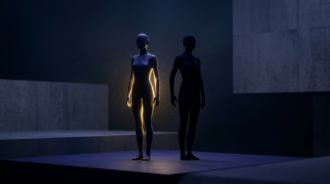 Art style: cinematic, minimalist, abstract, conceptual art. The shadow detaches from the main silhouette's feet and becomes a separate, free-standing figure next to it. It doesn't attack or threaten; it simply stands there, a co-existing presence. ━━━━━━━━━━━━━━━━━━━━━━━━━━━━━━━━━━━━━━ FINAL STYLE ENFORCEMENT (this is the authoritative rendering directive — it overrides any style wording elsewhere in the prompt): Render this image entirely in "cinematic, minimalist, abstract, conceptual art" style. Match the lighting grammar, material response, colour science, level of realism / stylisation, line weight, and shading model typical of "cinematic, minimalist, abstract, conceptual art". Keep the subject, composition, camera angle, lighting direction, and colour palette from the description above — but EVERY surface, skin, fabric, material, and environmental element must be rendered in the "cinematic, minimalist, abstract, conceptual art" idiom, not in any other medium. Character appearance reference (MUST match exactly): - Главный Силуэт: Strong rule: style --- cinematic, minimalist, abstract, conceptual art ---. An androgynous, featureless human silhouette made of deep, dark indigo material, sometimes glowing with a soft internal golden light. The form is elegant and minimalist. - Тень: Strong rule: style --- cinematic, minimalist, abstract, conceptual art ---. A shadow that is nearly identical to the Main Silhouette but slightly distorted, its movements are desynchronized. It is made of a deeper, more absorbing darkness.