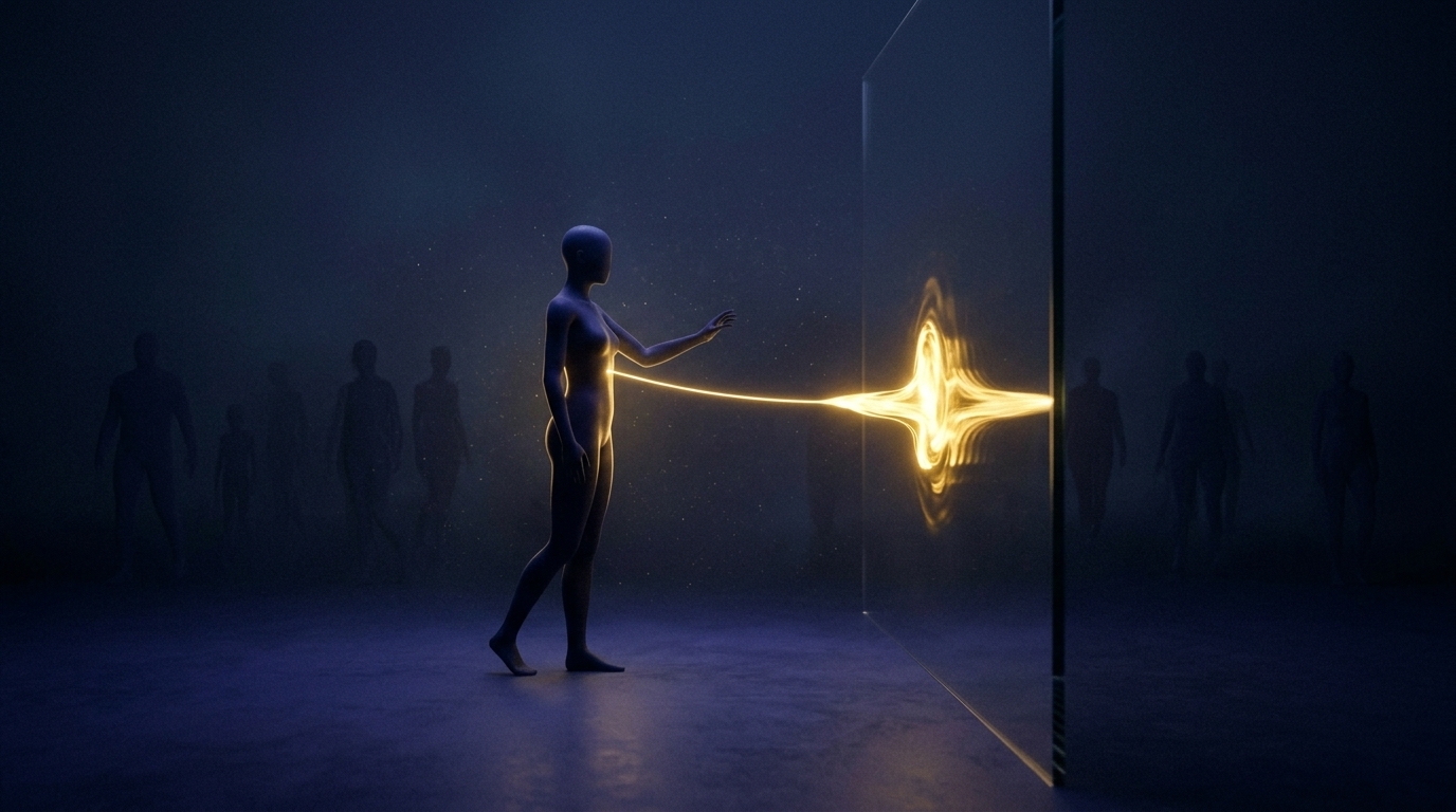 Art style: cinematic, minimalist, abstract, conceptual art. A single, beautiful golden thread of light stretches from the main silhouette towards the glass barrier. It touches the glass but cannot pass through, the light pooling at the point of contact. ━━━━━━━━━━━━━━━━━━━━━━━━━━━━━━━━━━━━━━ FINAL STYLE ENFORCEMENT (this is the authoritative rendering directive — it overrides any style wording elsewhere in the prompt): Render this image entirely in "cinematic, minimalist, abstract, conceptual art" style. Match the lighting grammar, material response, colour science, level of realism / stylisation, line weight, and shading model typical of "cinematic, minimalist, abstract, conceptual art". Keep the subject, composition, camera angle, lighting direction, and colour palette from the description above — but EVERY surface, skin, fabric, material, and environmental element must be rendered in the "cinematic, minimalist, abstract, conceptual art" idiom, not in any other medium. Character appearance reference (MUST match exactly): - Главный Силуэт: Strong rule: style --- cinematic, minimalist, abstract, conceptual art ---. An androgynous, featureless human silhouette made of deep, dark indigo material, sometimes glowing with a soft internal golden light. The form is elegant and minimalist. - Другие Силуэты: Strong rule: style --- cinematic, minimalist, abstract, conceptual art ---. Featureless human silhouettes of varying shapes and sizes, made of dark indigo or shadowy material. They are minimalist and symbolic.
