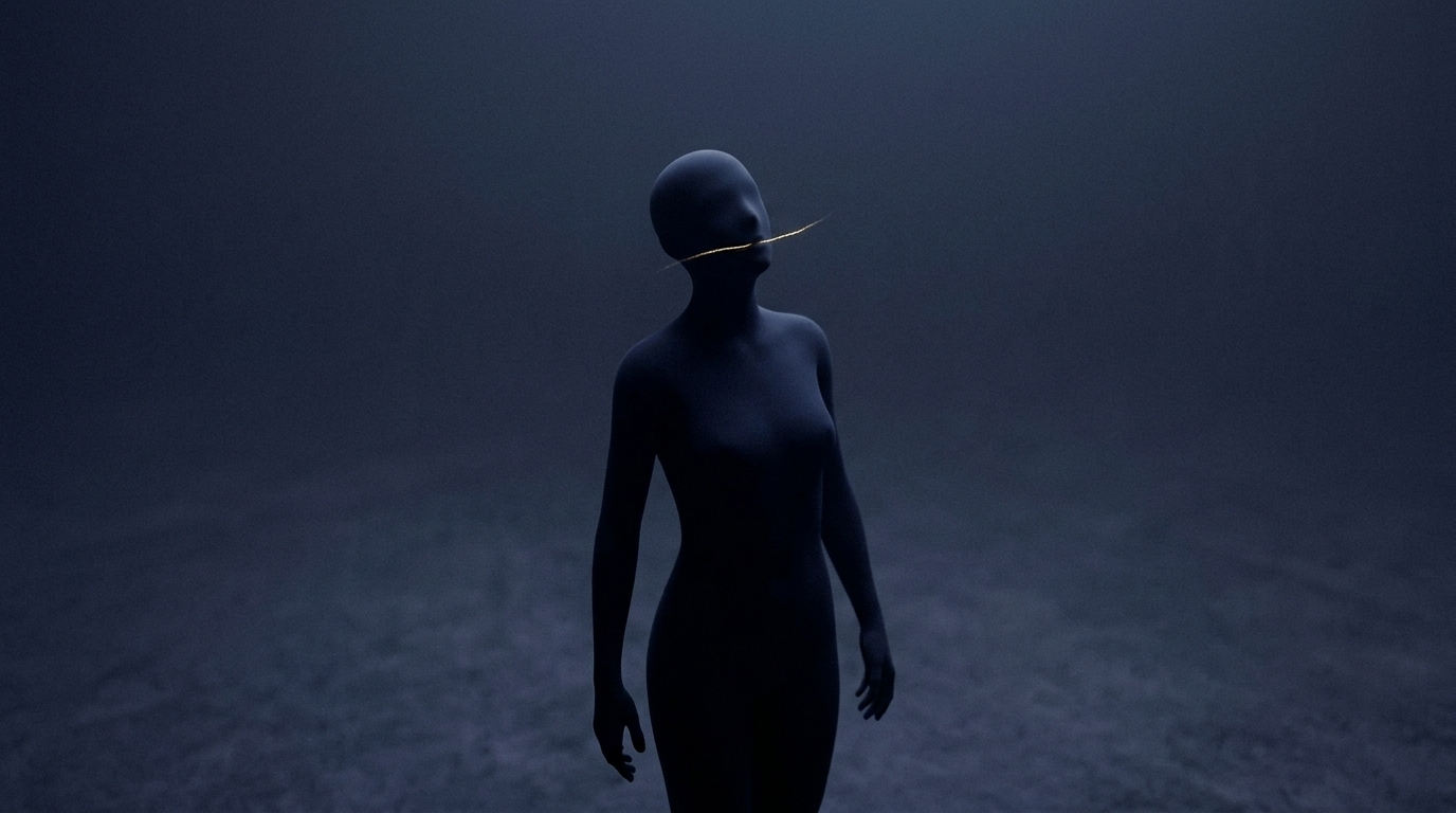 Art style: cinematic, minimalist, abstract, conceptual art. A silhouette tries to speak, but a soft shadow or a golden line gently seals its mouth. The role of 'being silent'. The gesture is not violent, but silencing. ━━━━━━━━━━━━━━━━━━━━━━━━━━━━━━━━━━━━━━ FINAL STYLE ENFORCEMENT (this is the authoritative rendering directive — it overrides any style wording elsewhere in the prompt): Render this image entirely in "cinematic, minimalist, abstract, conceptual art" style. Match the lighting grammar, material response, colour science, level of realism / stylisation, line weight, and shading model typical of "cinematic, minimalist, abstract, conceptual art". Keep the subject, composition, camera angle, lighting direction, and colour palette from the description above — but EVERY surface, skin, fabric, material, and environmental element must be rendered in the "cinematic, minimalist, abstract, conceptual art" idiom, not in any other medium. Character appearance reference (MUST match exactly): - Другие Силуэты: Strong rule: style --- cinematic, minimalist, abstract, conceptual art ---. Featureless human silhouettes of varying shapes and sizes, made of dark indigo or shadowy material. They are minimalist and symbolic.