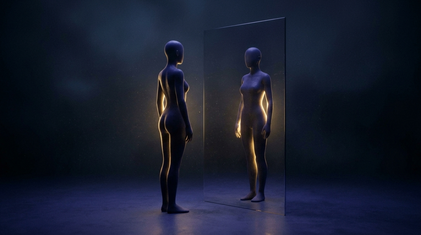 Art style: cinematic, minimalist, abstract, conceptual art. The main silhouette looks into a mirror, but this time, the reflection is a perfect, calm replica of itself. It is seeing itself clearly for the first time, without distortion. ━━━━━━━━━━━━━━━━━━━━━━━━━━━━━━━━━━━━━━ FINAL STYLE ENFORCEMENT (this is the authoritative rendering directive — it overrides any style wording elsewhere in the prompt): Render this image entirely in "cinematic, minimalist, abstract, conceptual art" style. Match the lighting grammar, material response, colour science, level of realism / stylisation, line weight, and shading model typical of "cinematic, minimalist, abstract, conceptual art". Keep the subject, composition, camera angle, lighting direction, and colour palette from the description above — but EVERY surface, skin, fabric, material, and environmental element must be rendered in the "cinematic, minimalist, abstract, conceptual art" idiom, not in any other medium. Character appearance reference (MUST match exactly): - Главный Силуэт: Strong rule: style --- cinematic, minimalist, abstract, conceptual art ---. An androgynous, featureless human silhouette made of deep, dark indigo material, sometimes glowing with a soft internal golden light. The form is elegant and minimalist.
