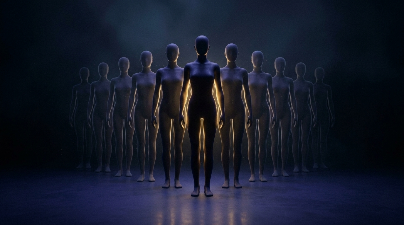 Art style: cinematic, minimalist, abstract, conceptual art. A recreation of the old scene of repetition: the main silhouette stands with the faint, transparent echo-silhouettes of its past selves behind it. The setup is familiar. ━━━━━━━━━━━━━━━━━━━━━━━━━━━━━━━━━━━━━━ FINAL STYLE ENFORCEMENT (this is the authoritative rendering directive — it overrides any style wording elsewhere in the prompt): Render this image entirely in "cinematic, minimalist, abstract, conceptual art" style. Match the lighting grammar, material response, colour science, level of realism / stylisation, line weight, and shading model typical of "cinematic, minimalist, abstract, conceptual art". Keep the subject, composition, camera angle, lighting direction, and colour palette from the description above — but EVERY surface, skin, fabric, material, and environmental element must be rendered in the "cinematic, minimalist, abstract, conceptual art" idiom, not in any other medium. Character appearance reference (MUST match exactly): - Главный Силуэт: Strong rule: style --- cinematic, minimalist, abstract, conceptual art ---. An androgynous, featureless human silhouette made of deep, dark indigo material, sometimes glowing with a soft internal golden light. The form is elegant and minimalist. - Другие Силуэты: Strong rule: style --- cinematic, minimalist, abstract, conceptual art ---. Featureless human silhouettes of varying shapes and sizes, made of dark indigo or shadowy material. They are minimalist and symbolic.