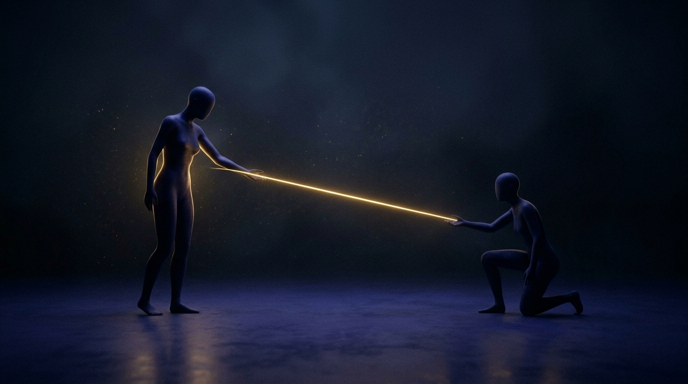 Art style: cinematic, minimalist, abstract, conceptual art. Symbol of rescuing: the main silhouette extends a line of golden light towards another, darker figure. As it does so, its own inner light visibly dims. ━━━━━━━━━━━━━━━━━━━━━━━━━━━━━━━━━━━━━━ FINAL STYLE ENFORCEMENT (this is the authoritative rendering directive — it overrides any style wording elsewhere in the prompt): Render this image entirely in "cinematic, minimalist, abstract, conceptual art" style. Match the lighting grammar, material response, colour science, level of realism / stylisation, line weight, and shading model typical of "cinematic, minimalist, abstract, conceptual art". Keep the subject, composition, camera angle, lighting direction, and colour palette from the description above — but EVERY surface, skin, fabric, material, and environmental element must be rendered in the "cinematic, minimalist, abstract, conceptual art" idiom, not in any other medium. Character appearance reference (MUST match exactly): - Главный Силуэт: Strong rule: style --- cinematic, minimalist, abstract, conceptual art ---. An androgynous, featureless human silhouette made of deep, dark indigo material, sometimes glowing with a soft internal golden light. The form is elegant and minimalist. - Другие Силуэты: Strong rule: style --- cinematic, minimalist, abstract, conceptual art ---. Featureless human silhouettes of varying shapes and sizes, made of dark indigo or shadowy material. They are minimalist and symbolic.