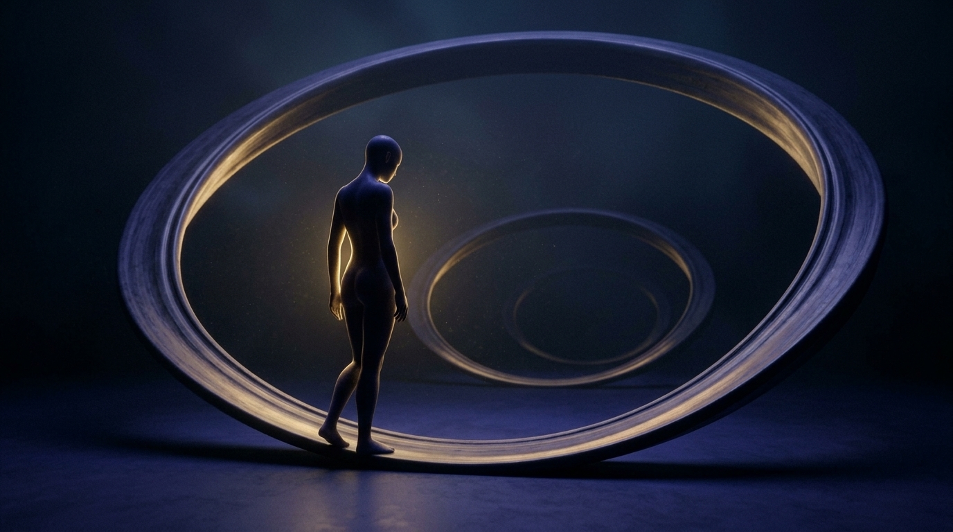 Art style: cinematic, minimalist, abstract, conceptual art. The silhouette stops at the very edge of the loop. It looks down at the circular path, hesitates, and does not automatically step onto it. A moment of conscious pause. ━━━━━━━━━━━━━━━━━━━━━━━━━━━━━━━━━━━━━━ FINAL STYLE ENFORCEMENT (this is the authoritative rendering directive — it overrides any style wording elsewhere in the prompt): Render this image entirely in "cinematic, minimalist, abstract, conceptual art" style. Match the lighting grammar, material response, colour science, level of realism / stylisation, line weight, and shading model typical of "cinematic, minimalist, abstract, conceptual art". Keep the subject, composition, camera angle, lighting direction, and colour palette from the description above — but EVERY surface, skin, fabric, material, and environmental element must be rendered in the "cinematic, minimalist, abstract, conceptual art" idiom, not in any other medium. Character appearance reference (MUST match exactly): - Главный Силуэт: Strong rule: style --- cinematic, minimalist, abstract, conceptual art ---. An androgynous, featureless human silhouette made of deep, dark indigo material, sometimes glowing with a soft internal golden light. The form is elegant and minimalist.
