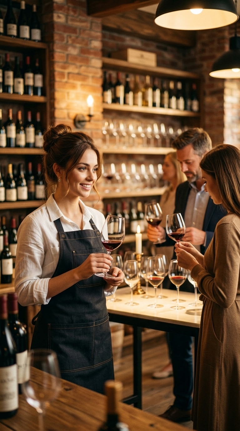 Art style: Кинематографичный, элегантный, с теплыми тонами.... Маша, счастливая и удовлетворенная, стоит в своем магазине или на выставке, с улыбкой наблюдая, как люди с интересом рассматривают и выбирают ее бокалы. Она держит в руках один из своих бокалов, с гордостью глядя на свое творение. ━━━━━━━━━━━━━━━━━━━━━━━━━━━━━━━━━━━━━━ FINAL STYLE ENFORCEMENT (this is the authoritative rendering directive — it overrides any style wording elsewhere in the prompt): Render this image entirely in "Кинематографичный, элегантный, с теплыми тонами..." style. Match the lighting grammar, material response, colour science, level of realism / stylisation, line weight, and shading model typical of "Кинематографичный, элегантный, с теплыми тонами...". Keep the subject, composition, camera angle, lighting direction, and colour palette from the description above — but EVERY surface, skin, fabric, material, and environmental element must be rendered in the "Кинематографичный, элегантный, с теплыми тонами..." idiom, not in any other medium. Character appearance reference (MUST match exactly): - Маша: Strong rule: style --- Кинематографичный, элегантный, с теплыми тонами... ---. Молодая женщина, 25-30 лет, с теплыми, добрыми глазами и увлеченным выражением лица. У нее каштановые волосы, собранные в элегантный пучок. Одета в стильную, но удобную одежду сомелье: темный фартук поверх белой рубашки.