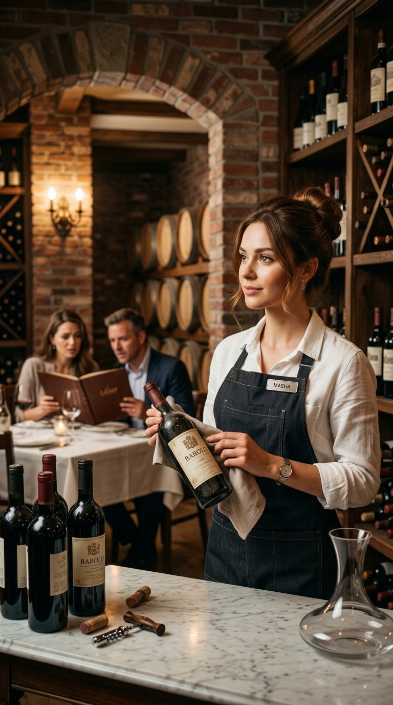 Art style: Кинематографичный, элегантный, с теплыми тонами.... Повзрослевшая Маша, теперь сомелье, стоит в элегантном винном погребе. Она с заботой протирает бутылку вина, наблюдая за гостями ресторана на заднем плане, которые выглядят растерянными, изучая винную карту. ━━━━━━━━━━━━━━━━━━━━━━━━━━━━━━━━━━━━━━ FINAL STYLE ENFORCEMENT (this is the authoritative rendering directive — it overrides any style wording elsewhere in the prompt): Render this image entirely in "Кинематографичный, элегантный, с теплыми тонами..." style. Match the lighting grammar, material response, colour science, level of realism / stylisation, line weight, and shading model typical of "Кинематографичный, элегантный, с теплыми тонами...". Keep the subject, composition, camera angle, lighting direction, and colour palette from the description above — but EVERY surface, skin, fabric, material, and environmental element must be rendered in the "Кинематографичный, элегантный, с теплыми тонами..." idiom, not in any other medium. Character appearance reference (MUST match exactly): - Маша: Strong rule: style --- Кинематографичный, элегантный, с теплыми тонами... ---. Молодая женщина, 25-30 лет, с теплыми, добрыми глазами и увлеченным выражением лица. У нее каштановые волосы, собранные в элегантный пучок. Одета в стильную, но удобную одежду сомелье: темный фартук поверх белой рубашки.