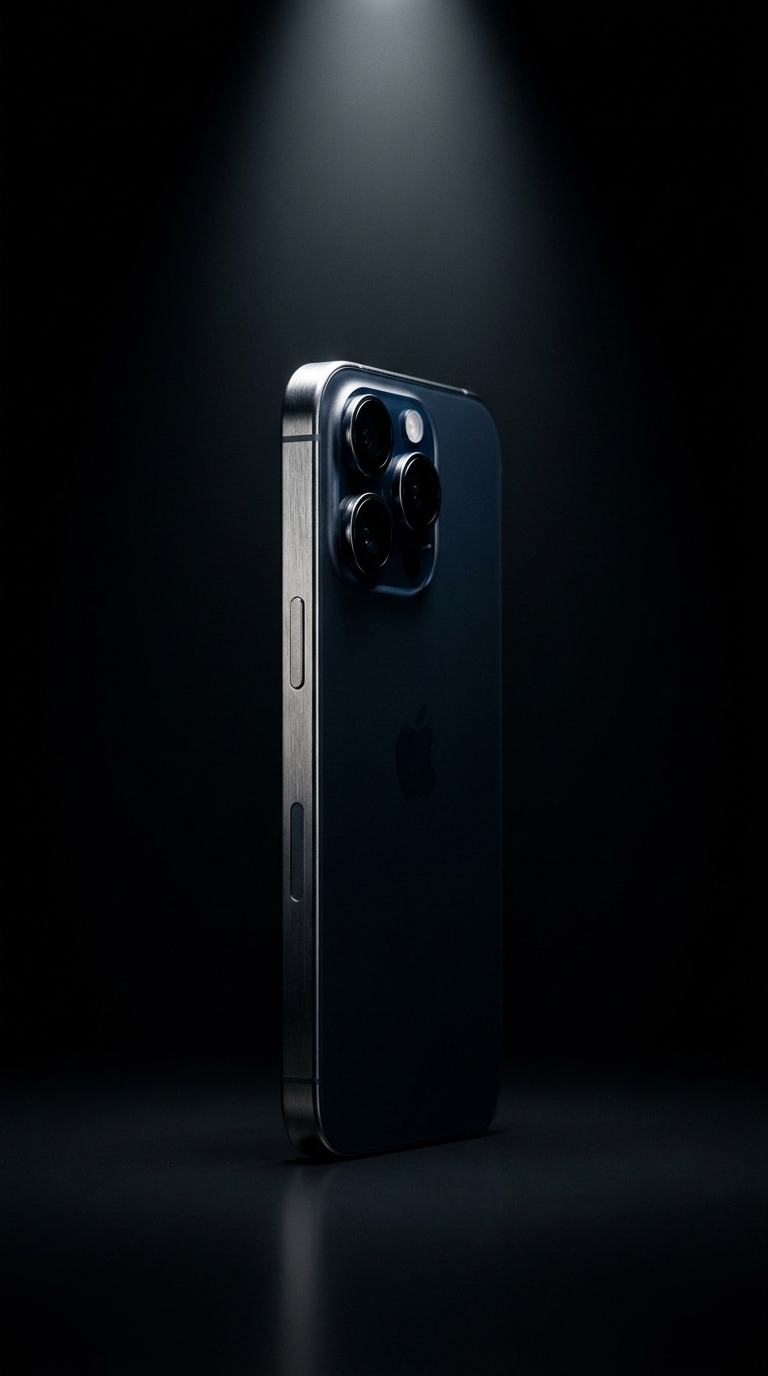 Art style: Realistic Photography. Абсолютно черный фон. Резкий луч света сверху драматично освещает силуэт нового iPhone 17 Pro ( не надо рисовать на изображение iphone 16), стоящего вертикально. Телефон в цвете Deep Blue его металлические грани поблескивают. Минималистичная, высокотехнологичная эстетика. ━━━━━━━━━━━━━━━━━━━━━━━━━━━━━━━━━━━━━━ FINAL STYLE ENFORCEMENT (this is the authoritative rendering directive — it overrides any style wording elsewhere in the prompt): Render this image entirely in "Realistic Photography" style. Match the lighting grammar, material response, colour science, level of realism / stylisation, line weight, and shading model typical of "Realistic Photography". Keep the subject, composition, camera angle, lighting direction, and colour palette from the description above — but EVERY surface, skin, fabric, material, and environmental element must be rendered in the "Realistic Photography" idiom, not in any other medium.