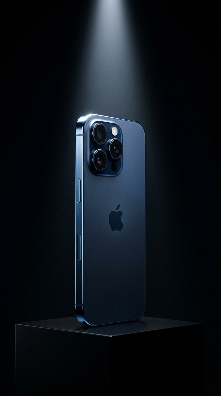 Art style: Realistic Photography. Абсолютно черный фон. Резкий луч света сверху драматично освещает силуэт нового iPhone 17 Pro ( не надо рисовать на изображение iphone 16), стоящего вертикально. Телефон в цвете Deep Blue его металлические грани поблескивают. Минималистичная, высокотехнологичная эстетика. ━━━━━━━━━━━━━━━━━━━━━━━━━━━━━━━━━━━━━━ FINAL STYLE ENFORCEMENT (this is the authoritative rendering directive — it overrides any style wording elsewhere in the prompt): Render this image entirely in "Realistic Photography" style. Match the lighting grammar, material response, colour science, level of realism / stylisation, line weight, and shading model typical of "Realistic Photography". Keep the subject, composition, camera angle, lighting direction, and colour palette from the description above — but EVERY surface, skin, fabric, material, and environmental element must be rendered in the "Realistic Photography" idiom, not in any other medium.
