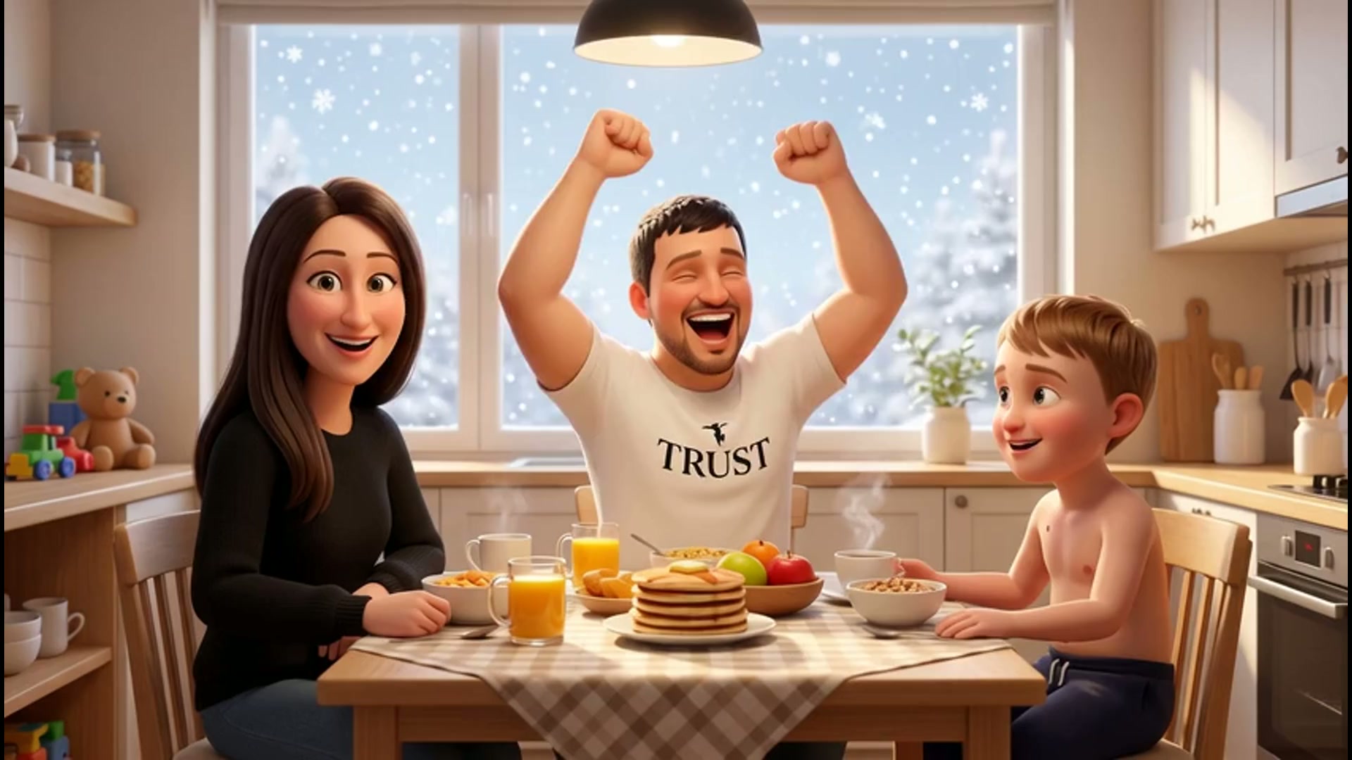 Art style: 3D Pixar. Уютная, залитая солнцем кухня в современном доме. За большим окном медленно падает снег. Анна, Миша и Ярослав весело смеются за завтраком, повсюду атмосфера любви и счастья. ━━━━━━━━━━━━━━━━━━━━━━━━━━━━━━━━━━━━━━ FINAL STYLE ENFORCEMENT (this is the authoritative rendering directive — it overrides any style wording elsewhere in the prompt): Render this image entirely in "3D Pixar" style. Match the lighting grammar, material response, colour science, level of realism / stylisation, line weight, and shading model typical of "3D Pixar". Keep the subject, composition, camera angle, lighting direction, and colour palette from the description above — but EVERY surface, skin, fabric, material, and environmental element must be rendered in the "3D Pixar" idiom, not in any other medium. Character appearance reference (MUST match exactly): - Анна: Женщина средних лет, около 35 лет, с овальной формой лица и светлой кожей с теплым подтоном. У нее длинные, прямые темно-каштановые волосы с центральным пробором, спадающие ниже плеч. Глаза выразительного орехово-зеленого цвета под аккуратно очерченными темными бровями. Она одета в лаконичный черный свитер с круглым вырезом. Выражение лица спокойное и приветливое, с легкой, естественной улыбкой и прямым, открытым взглядом в объектив. Телосложение стройное, поза фронтальная, подчеркивающая дружелюбие и уверенность в себе. - Миша: Мужчина лет 35 с овальным лицом и волевым подбородком, короткая темная стрижка и легкая щетина. У него светлая кожа и выразительные темные глаза. Телосложение среднее, плечи широкие. Одет в простую белую футболку с черным логотипом на груди. Выражение лица — чистый восторг и радость, рот широко открыт в ликующем крике. Он стоит, высоко подняв обе руки со сжатыми кулаками в жесте триумфа. - Ярослав: Мальчик примерно 6-8 лет с округлым лицом и светлой кожей. У него короткие светло-каштановые волосы, аккуратно зачесанные набок. Глаза темно-карие, взгляд добрый и немного застенчивый. Телосложение детское, слегка мягкое, на верхней правой части груди видна небольшая родинка. Он стоит прямо, руки опущены вдоль тела, на нем надеты только темно-синие спортивные брюки. На лице играет легкая, дружелюбная улыбка.