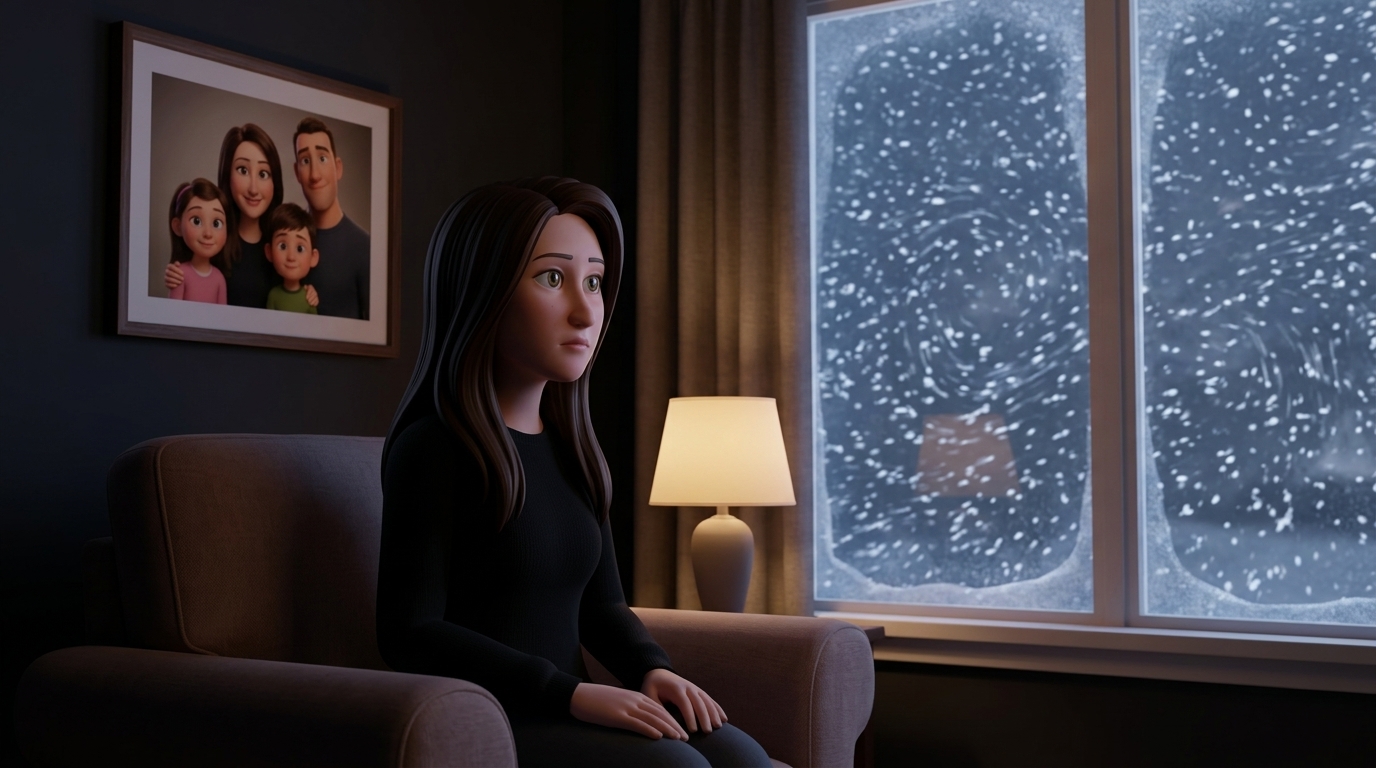 Art style: 3D Pixar. Анна сидит одна в полутемной гостиной своего дома. Она смотрит на семейную фотографию на стене, но ее взгляд пуст. За окном начинается метель, подчеркивая ее внутреннюю бурю. ━━━━━━━━━━━━━━━━━━━━━━━━━━━━━━━━━━━━━━ FINAL STYLE ENFORCEMENT (this is the authoritative rendering directive — it overrides any style wording elsewhere in the prompt): Render this image entirely in "3D Pixar" style. Match the lighting grammar, material response, colour science, level of realism / stylisation, line weight, and shading model typical of "3D Pixar". Keep the subject, composition, camera angle, lighting direction, and colour palette from the description above — but EVERY surface, skin, fabric, material, and environmental element must be rendered in the "3D Pixar" idiom, not in any other medium. Character appearance reference (MUST match exactly): - Анна: Женщина средних лет, около 35 лет, с овальной формой лица и светлой кожей с теплым подтоном. У нее длинные, прямые темно-каштановые волосы с центральным пробором, спадающие ниже плеч. Глаза выразительного орехово-зеленого цвета под аккуратно очерченными темными бровями. Она одета в лаконичный черный свитер с круглым вырезом. Выражение лица спокойное и приветливое, с легкой, естественной улыбкой и прямым, открытым взглядом в объектив. Телосложение стройное, поза фронтальная, подчеркивающая дружелюбие и уверенность в себе.