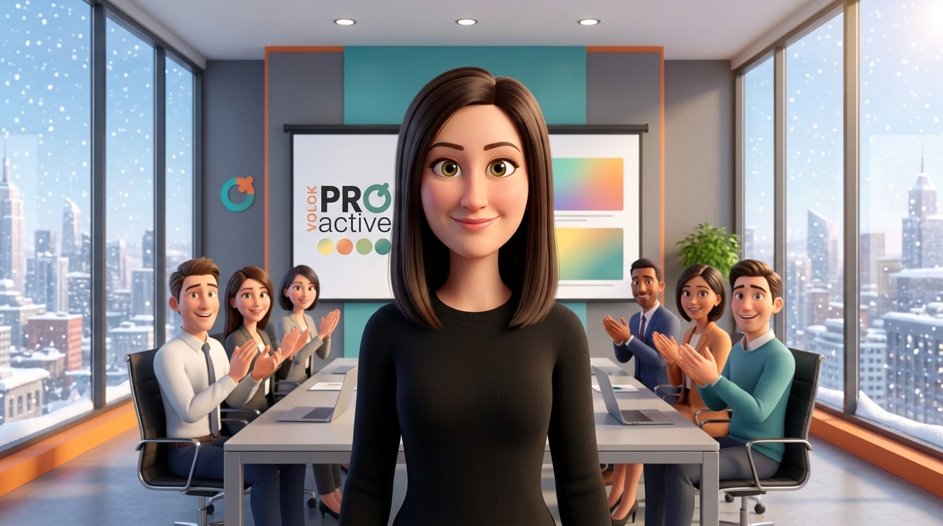 Art style: 3D Pixar. Стильный, минималистичный офис с панорамными окнами, за которыми виден заснеженный город. Анна в центре внимания, она только что закончила успешную презентацию, коллеги ей аплодируют. ━━━━━━━━━━━━━━━━━━━━━━━━━━━━━━━━━━━━━━ FINAL STYLE ENFORCEMENT (this is the authoritative rendering directive — it overrides any style wording elsewhere in the prompt): Render this image entirely in "3D Pixar" style. Match the lighting grammar, material response, colour science, level of realism / stylisation, line weight, and shading model typical of "3D Pixar". Keep the subject, composition, camera angle, lighting direction, and colour palette from the description above — but EVERY surface, skin, fabric, material, and environmental element must be rendered in the "3D Pixar" idiom, not in any other medium. Character appearance reference (MUST match exactly): - Анна: Женщина средних лет, около 35 лет, с овальной формой лица и светлой кожей с теплым подтоном. У нее длинные, прямые темно-каштановые волосы с центральным пробором, спадающие ниже плеч. Глаза выразительного орехово-зеленого цвета под аккуратно очерченными темными бровями. Она одета в лаконичный черный свитер с круглым вырезом. Выражение лица спокойное и приветливое, с легкой, естественной улыбкой и прямым, открытым взглядом в объектив. Телосложение стройное, поза фронтальная, подчеркивающая дружелюбие и уверенность в себе. Reference images context (match the visual style and elements from these): - Логотип и цветовая палитра (style_reference): Современный логотип с текстом 'VOLOK PROactive' в серых, оранжевых и бирюзовых тонах, дополненный набором градиентных цветовых кругов. Изображение демонстрирует типографику и гармоничную цветовую схему для брендинга.
