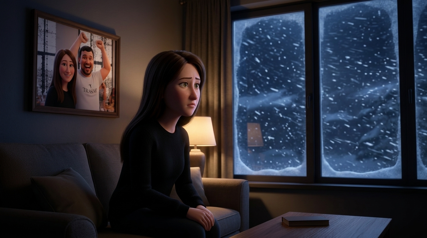 Art style: 3D Pixar. Анна сидит одна в полутемной гостиной своего дома. Она смотрит на семейную фотографию на стене, но ее взгляд пуст. За окном начинается метель, подчеркивая ее внутреннюю бурю. ━━━━━━━━━━━━━━━━━━━━━━━━━━━━━━━━━━━━━━ FINAL STYLE ENFORCEMENT (this is the authoritative rendering directive — it overrides any style wording elsewhere in the prompt): Render this image entirely in "3D Pixar" style. Match the lighting grammar, material response, colour science, level of realism / stylisation, line weight, and shading model typical of "3D Pixar". Keep the subject, composition, camera angle, lighting direction, and colour palette from the description above — but EVERY surface, skin, fabric, material, and environmental element must be rendered in the "3D Pixar" idiom, not in any other medium. Character appearance reference (MUST match exactly): - Миша: Мужчина лет 35 с овальным лицом и волевым подбородком, короткая темная стрижка и легкая щетина. У него светлая кожа и выразительные темные глаза. Телосложение среднее, плечи широкие. Одет в простую белую футболку с черным логотипом на груди. Выражение лица — чистый восторг и радость, рот широко открыт в ликующем крике. Он стоит, высоко подняв обе руки со сжатыми кулаками в жесте триумфа. - Анна: Женщина средних лет, около 35 лет, с овальной формой лица и светлой кожей с теплым подтоном. У нее длинные, прямые темно-каштановые волосы с центральным пробором, спадающие ниже плеч. Глаза выразительного орехово-зеленого цвета под аккуратно очерченными темными бровями. Она одета в лаконичный черный свитер с круглым вырезом. Выражение лица спокойное и приветливое, с легкой, естественной улыбкой и прямым, открытым взглядом в объектив. Телосложение стройное, поза фронтальная, подчеркивающая дружелюбие и уверенность в себе.
