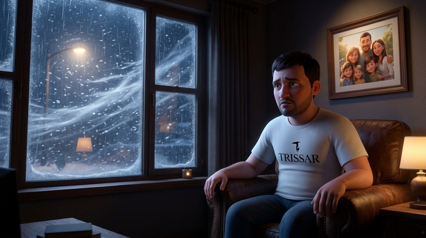 Art style: 3D Pixar. Миша сидит один в полутемной гостиной своего дома. Он смотрит на семейную фотографию на стене, но его взгляд пуст. За окном начинается метель, подчеркивая ее внутреннюю бурю. ━━━━━━━━━━━━━━━━━━━━━━━━━━━━━━━━━━━━━━ FINAL STYLE ENFORCEMENT (this is the authoritative rendering directive — it overrides any style wording elsewhere in the prompt): Render this image entirely in "3D Pixar" style. Match the lighting grammar, material response, colour science, level of realism / stylisation, line weight, and shading model typical of "3D Pixar". Keep the subject, composition, camera angle, lighting direction, and colour palette from the description above — but EVERY surface, skin, fabric, material, and environmental element must be rendered in the "3D Pixar" idiom, not in any other medium. Character appearance reference (MUST match exactly): - Миша: Мужчина лет 35 с овальным лицом и волевым подбородком, короткая темная стрижка и легкая щетина. У него светлая кожа и выразительные темные глаза. Телосложение среднее, плечи широкие. Одет в простую белую футболку с черным логотипом на груди. Выражение лица — чистый восторг и радость, рот широко открыт в ликующем крике. Он стоит, высоко подняв обе руки со сжатыми кулаками в жесте триумфа.