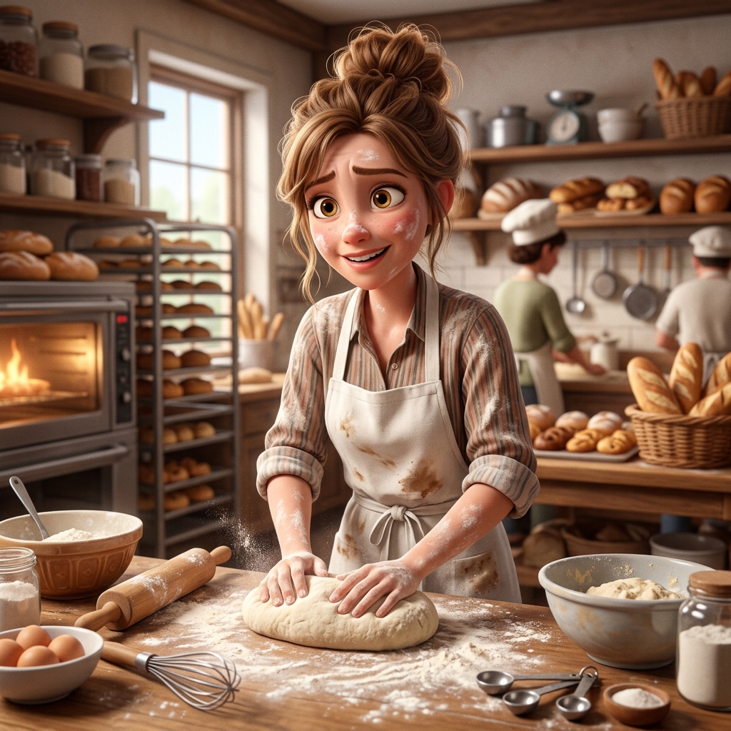 Strong rule: style --- 3D Pixar ---. A young baker in their late 20s, with flour smudges on their cheeks and a messy bun. Wears a classic white apron and has expressive, slightly tired eyes that can show both panic and determination. Style is relatable and slightly stylized, like a modern animated character.
