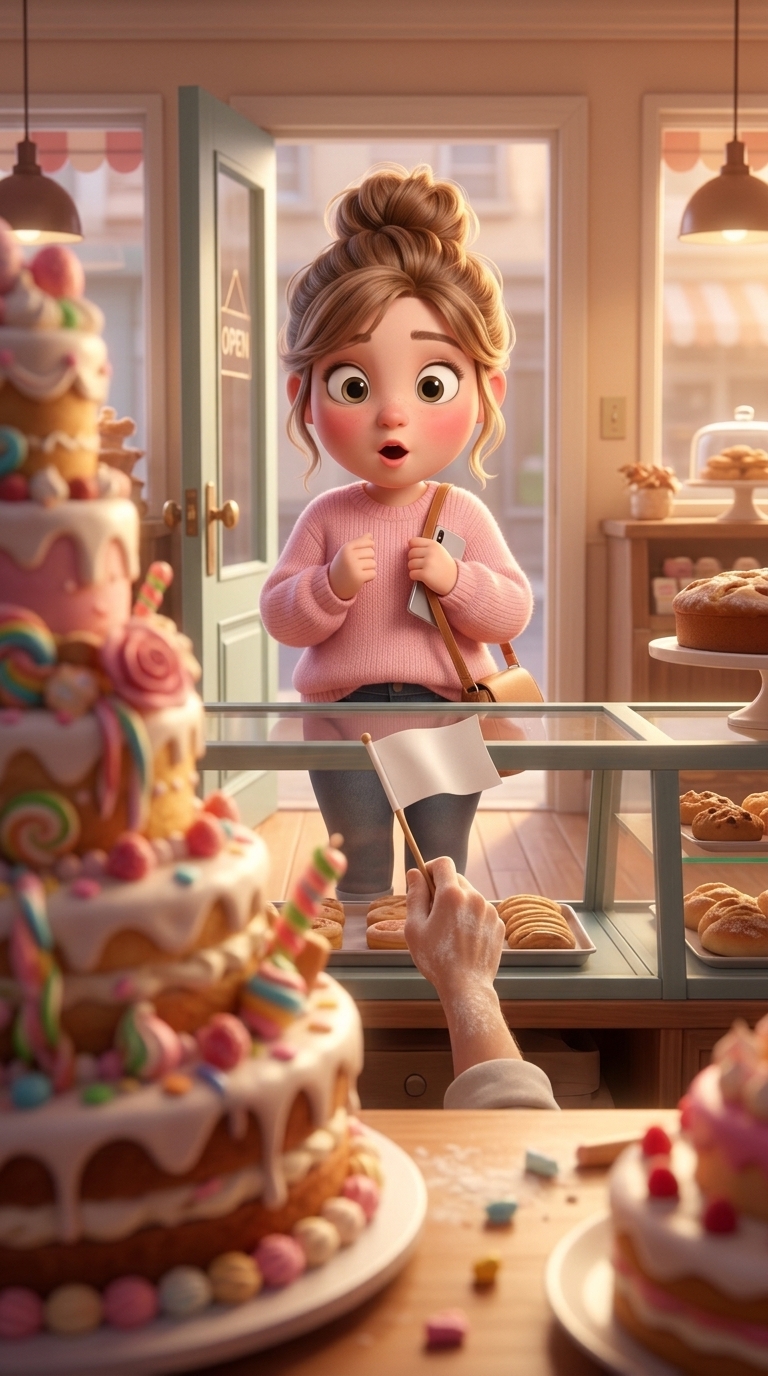 Art style: 3D Pixar. The door opens and the cheerful Customer walks in. Their face lights up with awe as they see the cake. The shot is from behind the cake, looking at the customer's delighted expression. We see the Baker's hand slowly rising from behind the counter, holding a single white flag of surrender. ━━━━━━━━━━━━━━━━━━━━━━━━━━━━━━━━━━━━━━ FINAL STYLE ENFORCEMENT (this is the authoritative rendering directive — it overrides any style wording elsewhere in the prompt): Render this image entirely in "3D Pixar" style. Match the lighting grammar, material response, colour science, level of realism / stylisation, line weight, and shading model typical of "3D Pixar". Keep the subject, composition, camera angle, lighting direction, and colour palette from the description above — but EVERY surface, skin, fabric, material, and environmental element must be rendered in the "3D Pixar" idiom, not in any other medium. Character appearance reference (MUST match exactly): - Customer: Strong rule: style --- 3D Pixar ---. A cute 2D animated cartoon character of a young woman customer. She has light brown hair worn in a loose messy bun with a few strands falling on her face. Big round innocent eyes, rosy cheeks, a wide sweet smile that shows she means well but doesn't quite think things through. She is wearing a cozy pastel pink sweater and carrying a small handbag. Slightly chubby friendly face, soft features, warm skin tone. Her expression is genuinely happy and oblivious — like someone who just sent a completely unreasonable request and sees absolutely nothing wrong with it. She is holding her phone in one hand, typing cheerfully. Character design is clean, modern and charming — similar to a Disney or Pixar-style 2D illustration but simpler. Full body character on a white background, front facing, ready for animation.