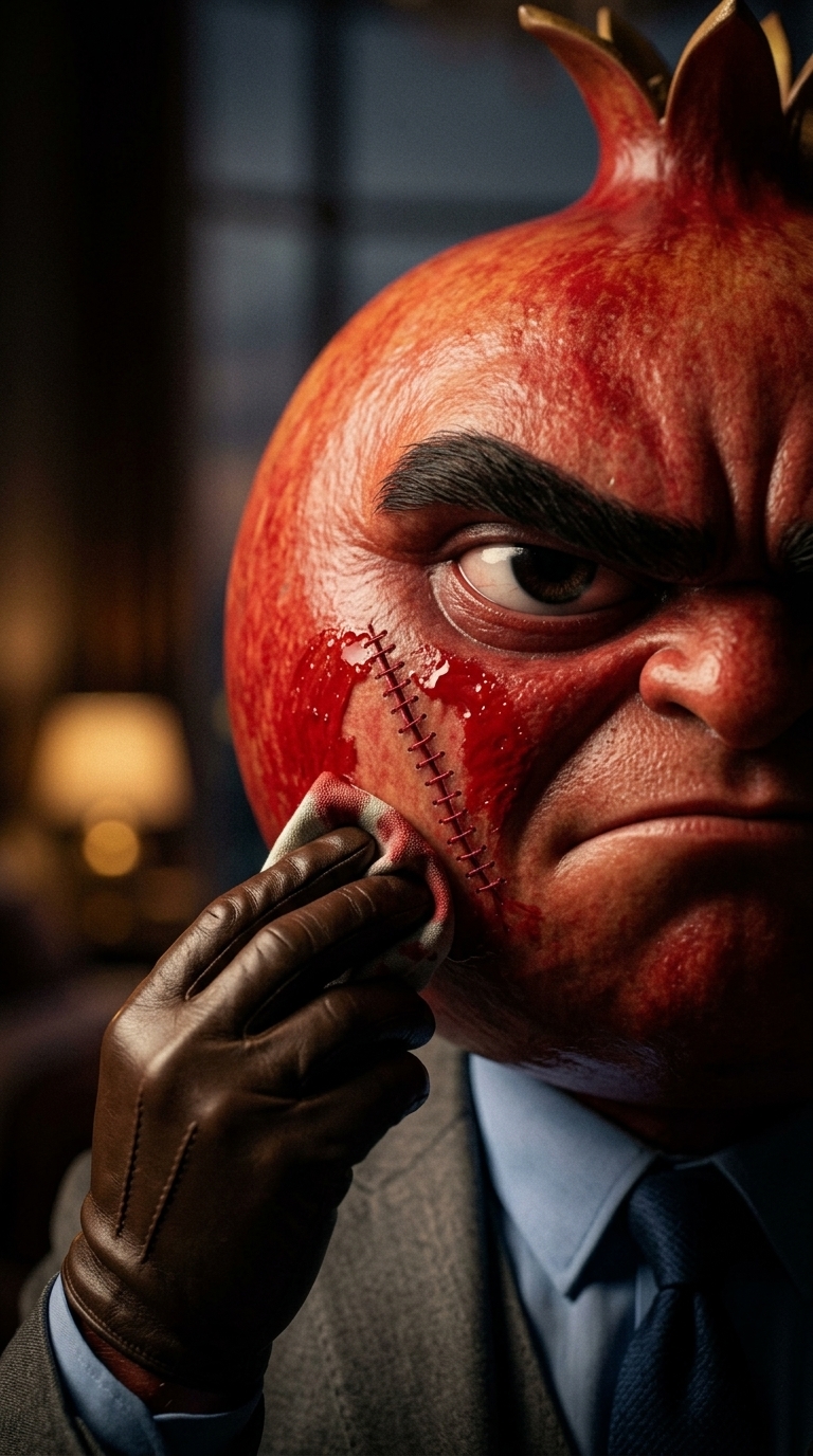 Art style: Cinematic, dramatic lighting, realistic with a .... A dramatic close-up on the father's face. He slowly and deliberately wipes away a layer of red paint from his cheek with a cloth. Underneath, a faint, stitched seam is revealed, identical to the one on the girl's face. ━━━━━━━━━━━━━━━━━━━━━━━━━━━━━━━━━━━━━━ FINAL STYLE ENFORCEMENT (this is the authoritative rendering directive — it overrides any style wording elsewhere in the prompt): Render this image entirely in "Cinematic, dramatic lighting, realistic with a ..." style. Match the lighting grammar, material response, colour science, level of realism / stylisation, line weight, and shading model typical of "Cinematic, dramatic lighting, realistic with a ...". Keep the subject, composition, camera angle, lighting direction, and colour palette from the description above — but EVERY surface, skin, fabric, material, and environmental element must be rendered in the "Cinematic, dramatic lighting, realistic with a ..." idiom, not in any other medium. Character appearance reference (MUST match exactly): - Отец-гранат: Мужчина среднего возраста с головой в форме крупного спелого граната. У него круглое лицо с текстурой красной кожуры, густые черные брови и сердитые темные глаза. Вместо волос на макушке возвышается золотистая корона плода. Телосложение коренастое и мускулистое. Персонаж одет в строгий серый костюм-тройку, голубую рубашку и темно-синий галстук. На руках надеты коричневые кожаные перчатки, на ногах — начищенные коричневые туфли. Выражение лица крайне злое и суровое, он стоит прямо, сжав кулаки в напряженной и властной позе.
