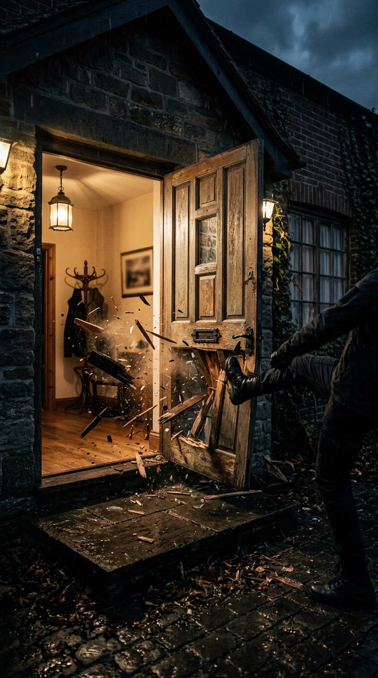 Art style: Cinematic, dramatic lighting, realistic with a .... Exterior shot of a house's front door at night. The door is old and wooden. Suddenly, the door is violently kicked in, wood splinters flying inwards, shattering the peace of the home. The view is from the outside looking in. ━━━━━━━━━━━━━━━━━━━━━━━━━━━━━━━━━━━━━━ FINAL STYLE ENFORCEMENT (this is the authoritative rendering directive — it overrides any style wording elsewhere in the prompt): Render this image entirely in "Cinematic, dramatic lighting, realistic with a ..." style. Match the lighting grammar, material response, colour science, level of realism / stylisation, line weight, and shading model typical of "Cinematic, dramatic lighting, realistic with a ...". Keep the subject, composition, camera angle, lighting direction, and colour palette from the description above — but EVERY surface, skin, fabric, material, and environmental element must be rendered in the "Cinematic, dramatic lighting, realistic with a ..." idiom, not in any other medium.