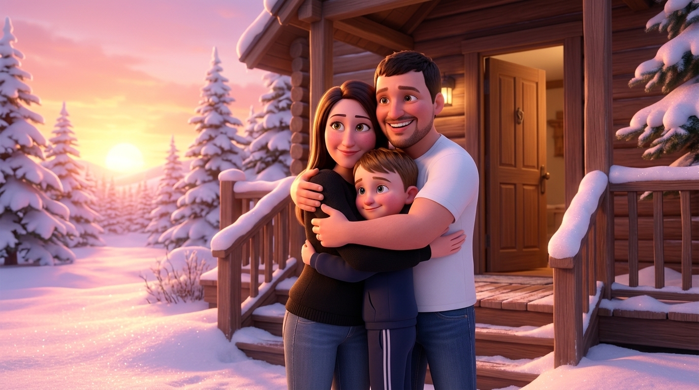 Art style: 3D Pixar. Рассвет. Анна открывает входную дверь. На крыльце ее ждут Миша и Ярослав. Они ничего не спрашивают, просто крепко обнимают ее. Вся семья вместе смотрит на восходящее солнце, которое окрашивает снег в розовые и золотые тона. ━━━━━━━━━━━━━━━━━━━━━━━━━━━━━━━━━━━━━━ FINAL STYLE ENFORCEMENT (this is the authoritative rendering directive — it overrides any style wording elsewhere in the prompt): Render this image entirely in "3D Pixar" style. Match the lighting grammar, material response, colour science, level of realism / stylisation, line weight, and shading model typical of "3D Pixar". Keep the subject, composition, camera angle, lighting direction, and colour palette from the description above — but EVERY surface, skin, fabric, material, and environmental element must be rendered in the "3D Pixar" idiom, not in any other medium. Character appearance reference (MUST match exactly): - Анна: Женщина средних лет, около 35 лет, с овальной формой лица и светлой кожей с теплым подтоном. У нее длинные, прямые темно-каштановые волосы с центральным пробором, спадающие ниже плеч. Глаза выразительного орехово-зеленого цвета под аккуратно очерченными темными бровями. Она одета в лаконичный черный свитер с круглым вырезом. Выражение лица спокойное и приветливое, с легкой, естественной улыбкой и прямым, открытым взглядом в объектив. Телосложение стройное, поза фронтальная, подчеркивающая дружелюбие и уверенность в себе. - Миша: Мужчина лет 35 с овальным лицом и волевым подбородком, короткая темная стрижка и легкая щетина. У него светлая кожа и выразительные темные глаза. Телосложение среднее, плечи широкие. Одет в простую белую футболку с черным логотипом на груди. Выражение лица — чистый восторг и радость, рот широко открыт в ликующем крике. Он стоит, высоко подняв обе руки со сжатыми кулаками в жесте триумфа. - Ярослав: Мальчик примерно 6-8 лет с округлым лицом и светлой кожей. У него короткие светло-каштановые волосы, аккуратно зачесанные набок. Глаза темно-карие, взгляд добрый и немного застенчивый. Телосложение детское, слегка мягкое, на верхней правой части груди видна небольшая родинка. Он стоит прямо, руки опущены вдоль тела, на нем надеты только темно-синие спортивные брюки. На лице играет легкая, дружелюбная улыбка.