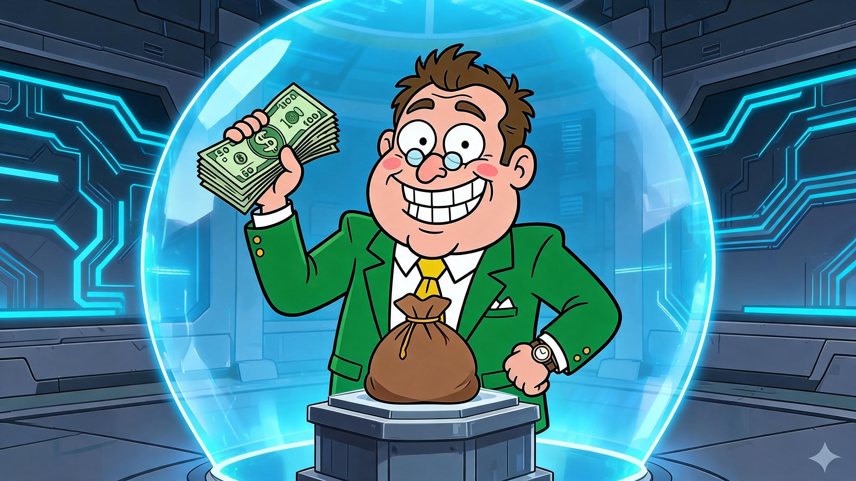 Art style: Family Guy style 2D animation, vibrant colors, caricature of a financial expert, clean vector lines, high contrast, 4K resolution, professional motion graphics.. A high-tech laboratory setting with metallic surfaces and glowing blue circuitry. In the center, a heavy leather sack of money sits on a pedestal. A pale, spindly hand in a pinstriped suit sleeve reaches from the shadows toward the bag. A shimmering, translucent blue energy dome surrounds the pedestal. Sharp, high-contrast lighting with neon blue accents. ━━━━━━━━━━━━━━━━━━━━━━━━━━━━━━━━━━━━━━ FINAL STYLE ENFORCEMENT (this is the authoritative rendering directive — it overrides any style wording elsewhere in the prompt): Render this image entirely in "Family Guy style 2D animation, vibrant colors, caricature of a financial expert, clean vector lines, high contrast, 4K resolution, professional motion graphics." style. Match the lighting grammar, material response, colour science, level of realism / stylisation, line weight, and shading model typical of "Family Guy style 2D animation, vibrant colors, caricature of a financial expert, clean vector lines, high contrast, 4K resolution, professional motion graphics.". Keep the subject, composition, camera angle, lighting direction, and colour palette from the description above — but EVERY surface, skin, fabric, material, and environmental element must be rendered in the "Family Guy style 2D animation, vibrant colors, caricature of a financial expert, clean vector lines, high contrast, 4K resolution, professional motion graphics." idiom, not in any other medium. Character appearance reference (MUST match exactly): - Nick: Мужчина средних лет плотного телосложения с круглым лицом, двойным подбородком и румяными щеками. У него короткие, слегка взъерошенные каштановые волосы и маленькие круглые очки на крупном носу. Он одет в ярко-зеленый пиджак с золотыми пуговицами, белую рубашку и широкий желтый галстук. На левом запястье видны золотые часы. Персонаж широко и восторженно улыбается, демонстрируя ровные белые зубы. Он стоит в уверенной позе, высоко подняв в одной руке веер из стодолларовых купюр, а другую руку положив на бедро.