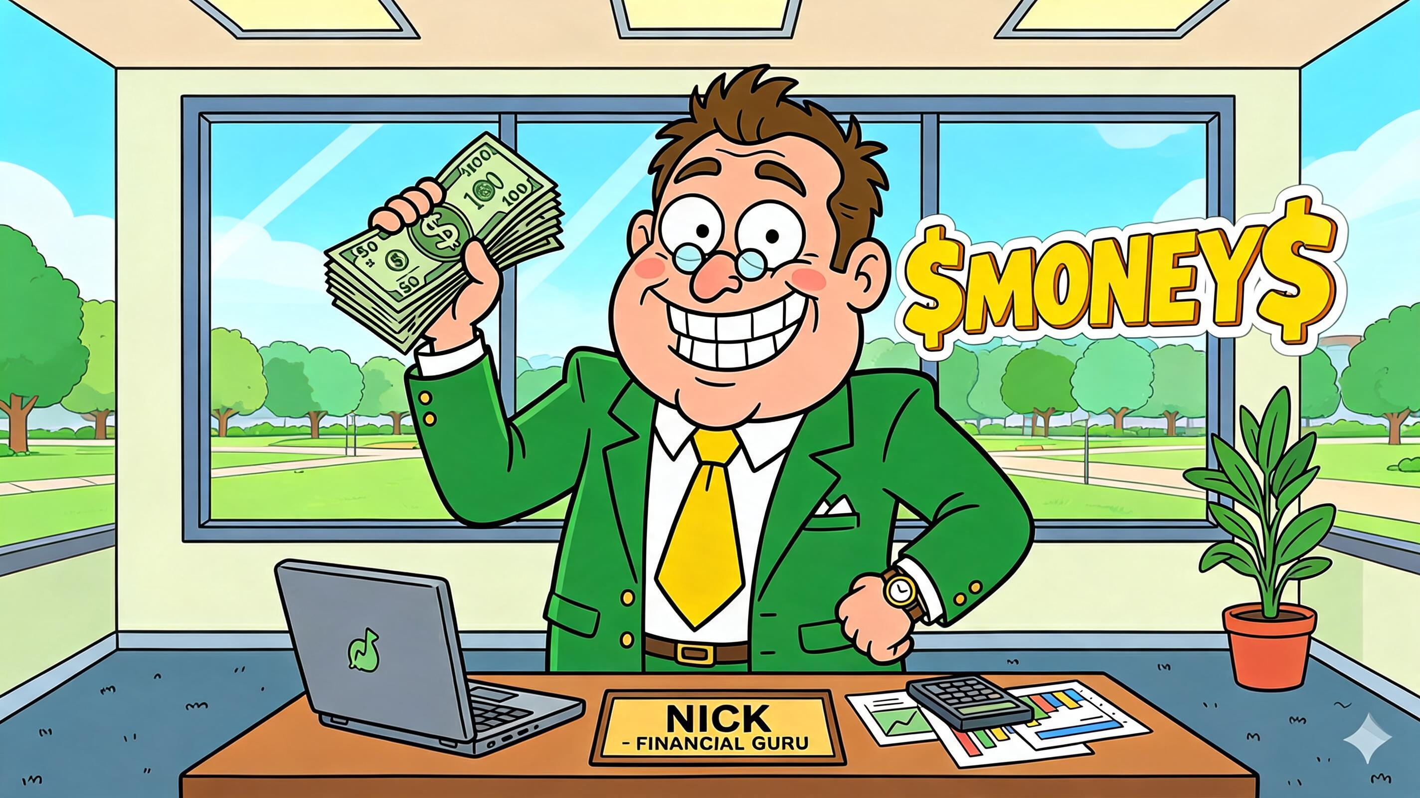 Art style: Family Guy style 2D animation, vibrant colors, caricature of a financial expert, clean vector lines, high contrast, 4K resolution, professional motion graphics.. A bright, airy studio with floor-to-ceiling windows overlooking a green park. Nick stands in the foreground, his face filling half the frame. Large, bold three-dimensional text in vibrant yellow and white floats in the air beside him. The lighting is warm and inviting, like a sunny morning with soft shadows. ━━━━━━━━━━━━━━━━━━━━━━━━━━━━━━━━━━━━━━ FINAL STYLE ENFORCEMENT (this is the authoritative rendering directive — it overrides any style wording elsewhere in the prompt): Render this image entirely in "Family Guy style 2D animation, vibrant colors, caricature of a financial expert, clean vector lines, high contrast, 4K resolution, professional motion graphics." style. Match the lighting grammar, material response, colour science, level of realism / stylisation, line weight, and shading model typical of "Family Guy style 2D animation, vibrant colors, caricature of a financial expert, clean vector lines, high contrast, 4K resolution, professional motion graphics.". Keep the subject, composition, camera angle, lighting direction, and colour palette from the description above — but EVERY surface, skin, fabric, material, and environmental element must be rendered in the "Family Guy style 2D animation, vibrant colors, caricature of a financial expert, clean vector lines, high contrast, 4K resolution, professional motion graphics." idiom, not in any other medium. Character appearance reference (MUST match exactly): - Nick: Мужчина средних лет плотного телосложения с круглым лицом, двойным подбородком и румяными щеками. У него короткие, слегка взъерошенные каштановые волосы и маленькие круглые очки на крупном носу. Он одет в ярко-зеленый пиджак с золотыми пуговицами, белую рубашку и широкий желтый галстук. На левом запястье видны золотые часы. Персонаж широко и восторженно улыбается, демонстрируя ровные белые зубы. Он стоит в уверенной позе, высоко подняв в одной руке веер из стодолларовых купюр, а другую руку положив на бедро.