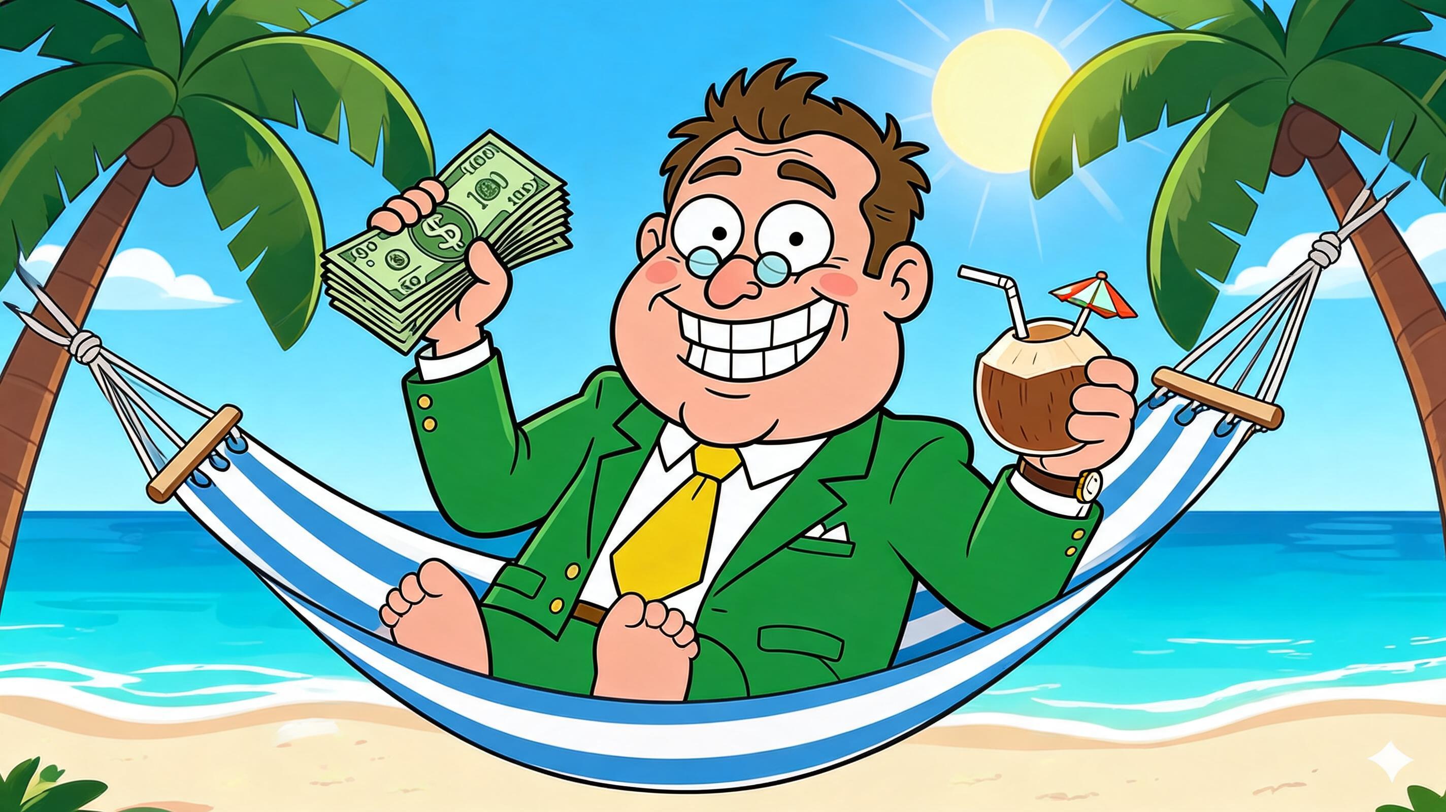Art style: Family Guy style 2D animation, vibrant colors, caricature of a financial expert, clean vector lines, high contrast, 4K resolution, professional motion graphics.. A pristine tropical beach with white sand and turquoise water gently lapping the shore. Two palm trees hold up a striped hammock. An older man with silver hair, wearing linen clothes and sunglasses, lies in the hammock holding a coconut drink with an umbrella. Bright, overhead midday sun. ━━━━━━━━━━━━━━━━━━━━━━━━━━━━━━━━━━━━━━ FINAL STYLE ENFORCEMENT (this is the authoritative rendering directive — it overrides any style wording elsewhere in the prompt): Render this image entirely in "Family Guy style 2D animation, vibrant colors, caricature of a financial expert, clean vector lines, high contrast, 4K resolution, professional motion graphics." style. Match the lighting grammar, material response, colour science, level of realism / stylisation, line weight, and shading model typical of "Family Guy style 2D animation, vibrant colors, caricature of a financial expert, clean vector lines, high contrast, 4K resolution, professional motion graphics.". Keep the subject, composition, camera angle, lighting direction, and colour palette from the description above — but EVERY surface, skin, fabric, material, and environmental element must be rendered in the "Family Guy style 2D animation, vibrant colors, caricature of a financial expert, clean vector lines, high contrast, 4K resolution, professional motion graphics." idiom, not in any other medium. Character appearance reference (MUST match exactly): - Nick: Мужчина средних лет плотного телосложения с круглым лицом, двойным подбородком и румяными щеками. У него короткие, слегка взъерошенные каштановые волосы и маленькие круглые очки на крупном носу. Он одет в ярко-зеленый пиджак с золотыми пуговицами, белую рубашку и широкий желтый галстук. На левом запястье видны золотые часы. Персонаж широко и восторженно улыбается, демонстрируя ровные белые зубы. Он стоит в уверенной позе, высоко подняв в одной руке веер из стодолларовых купюр, а другую руку положив на бедро.