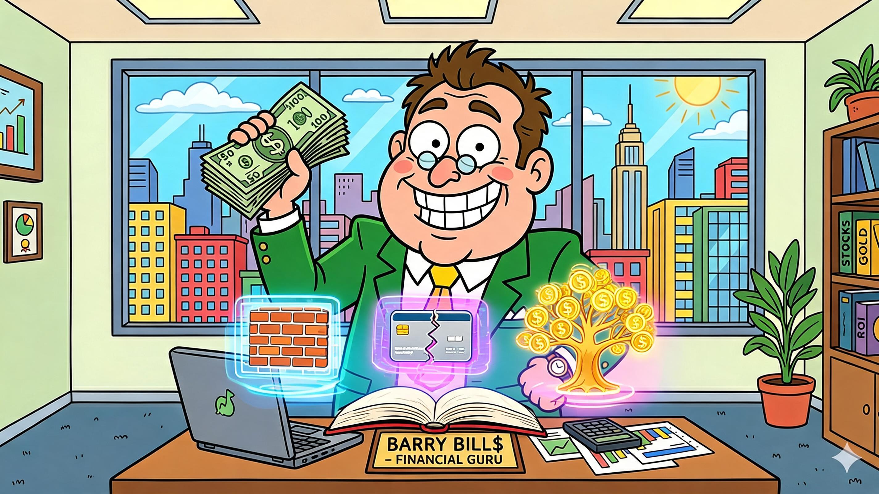 Art style: Family Guy style 2D animation, vibrant colors, caricature of a financial expert, clean vector lines, high contrast, 4K resolution, professional motion graphics.. A close-up of the open book on the desk. Three distinct holographic icons float above the pages: a brick wall, a broken credit card, and a golden tree. Each icon is vibrant and rotates slowly, casting colored light onto the paper below. The atmosphere is magical and informative. ━━━━━━━━━━━━━━━━━━━━━━━━━━━━━━━━━━━━━━ FINAL STYLE ENFORCEMENT (this is the authoritative rendering directive — it overrides any style wording elsewhere in the prompt): Render this image entirely in "Family Guy style 2D animation, vibrant colors, caricature of a financial expert, clean vector lines, high contrast, 4K resolution, professional motion graphics." style. Match the lighting grammar, material response, colour science, level of realism / stylisation, line weight, and shading model typical of "Family Guy style 2D animation, vibrant colors, caricature of a financial expert, clean vector lines, high contrast, 4K resolution, professional motion graphics.". Keep the subject, composition, camera angle, lighting direction, and colour palette from the description above — but EVERY surface, skin, fabric, material, and environmental element must be rendered in the "Family Guy style 2D animation, vibrant colors, caricature of a financial expert, clean vector lines, high contrast, 4K resolution, professional motion graphics." idiom, not in any other medium. Character appearance reference (MUST match exactly): - Nick: Мужчина средних лет плотного телосложения с круглым лицом, двойным подбородком и румяными щеками. У него короткие, слегка взъерошенные каштановые волосы и маленькие круглые очки на крупном носу. Он одет в ярко-зеленый пиджак с золотыми пуговицами, белую рубашку и широкий желтый галстук. На левом запястье видны золотые часы. Персонаж широко и восторженно улыбается, демонстрируя ровные белые зубы. Он стоит в уверенной позе, высоко подняв в одной руке веер из стодолларовых купюр, а другую руку положив на бедро.