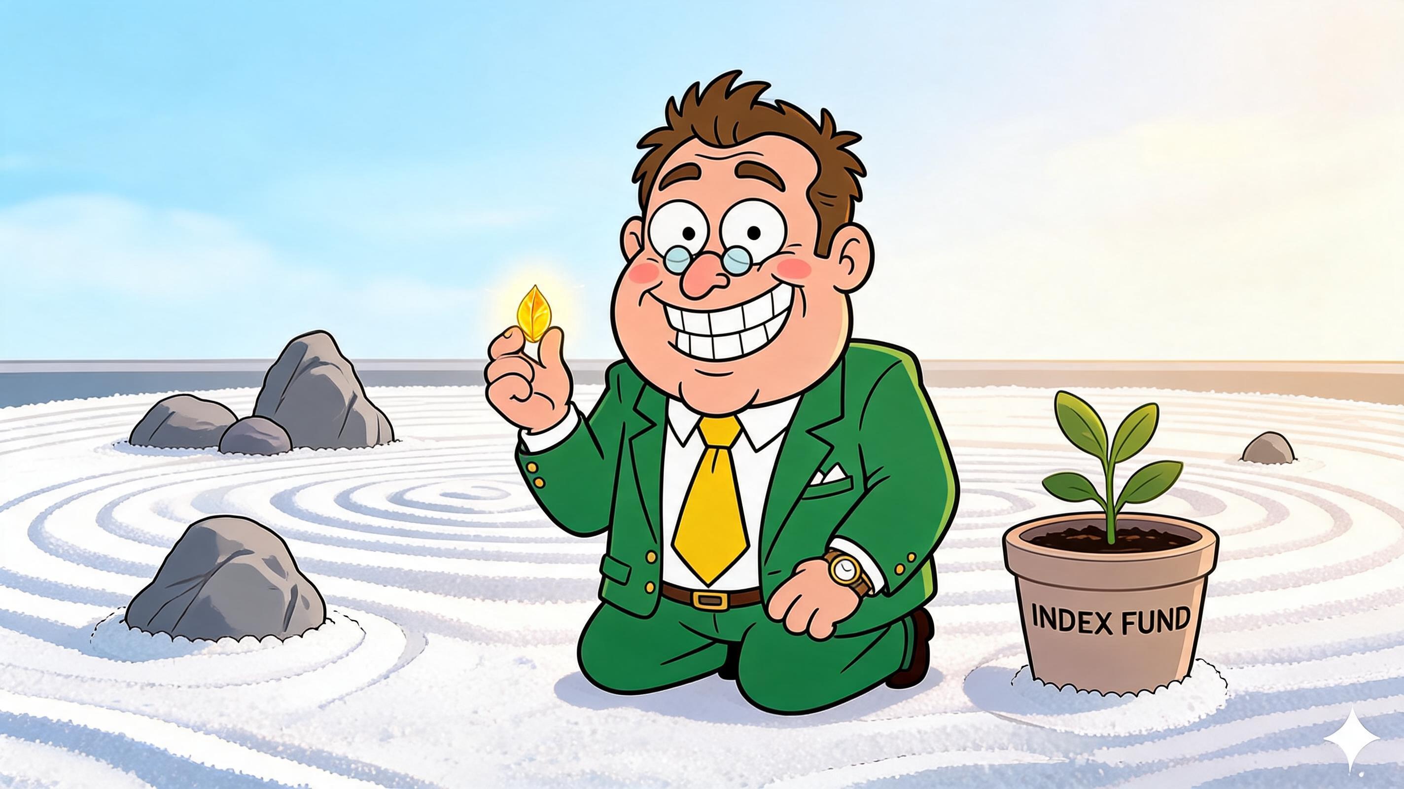 Art style: Family Guy style 2D animation, vibrant colors, caricature of a financial expert, clean vector lines, high contrast, 4K resolution, professional motion graphics.. A serene, Zen-like garden with white sand and smooth river stones. Nick kneels beside a ceramic pot labeled 'INDEX FUND'. He holds a single, glowing golden seed between his fingers. The lighting is soft, diffused morning light with a pale blue and gold palette. The mood is peaceful and full of potential. ━━━━━━━━━━━━━━━━━━━━━━━━━━━━━━━━━━━━━━ FINAL STYLE ENFORCEMENT (this is the authoritative rendering directive — it overrides any style wording elsewhere in the prompt): Render this image entirely in "Family Guy style 2D animation, vibrant colors, caricature of a financial expert, clean vector lines, high contrast, 4K resolution, professional motion graphics." style. Match the lighting grammar, material response, colour science, level of realism / stylisation, line weight, and shading model typical of "Family Guy style 2D animation, vibrant colors, caricature of a financial expert, clean vector lines, high contrast, 4K resolution, professional motion graphics.". Keep the subject, composition, camera angle, lighting direction, and colour palette from the description above — but EVERY surface, skin, fabric, material, and environmental element must be rendered in the "Family Guy style 2D animation, vibrant colors, caricature of a financial expert, clean vector lines, high contrast, 4K resolution, professional motion graphics." idiom, not in any other medium. Character appearance reference (MUST match exactly): - Nick: Мужчина средних лет плотного телосложения с круглым лицом, двойным подбородком и румяными щеками. У него короткие, слегка взъерошенные каштановые волосы и маленькие круглые очки на крупном носу. Он одет в ярко-зеленый пиджак с золотыми пуговицами, белую рубашку и широкий желтый галстук. На левом запястье видны золотые часы. Персонаж широко и восторженно улыбается, демонстрируя ровные белые зубы. Он стоит в уверенной позе, высоко подняв в одной руке веер из стодолларовых купюр, а другую руку положив на бедро.