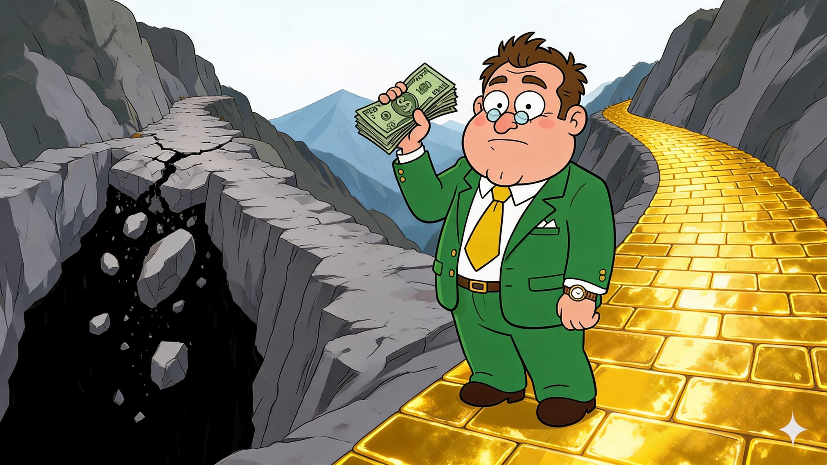 Art style: Family Guy style 2D animation, vibrant colors, caricature of a financial expert, clean vector lines, high contrast, 4K resolution, professional motion graphics.. A treacherous mountain pass where the left trail is made of cracked, falling rocks over a bottomless black chasm. The right trail is paved with polished, rectangular gold bricks that glow from within. Nick stands at the entrance of the golden path, looking back at the destruction with a serious face. ━━━━━━━━━━━━━━━━━━━━━━━━━━━━━━━━━━━━━━ FINAL STYLE ENFORCEMENT (this is the authoritative rendering directive — it overrides any style wording elsewhere in the prompt): Render this image entirely in "Family Guy style 2D animation, vibrant colors, caricature of a financial expert, clean vector lines, high contrast, 4K resolution, professional motion graphics." style. Match the lighting grammar, material response, colour science, level of realism / stylisation, line weight, and shading model typical of "Family Guy style 2D animation, vibrant colors, caricature of a financial expert, clean vector lines, high contrast, 4K resolution, professional motion graphics.". Keep the subject, composition, camera angle, lighting direction, and colour palette from the description above — but EVERY surface, skin, fabric, material, and environmental element must be rendered in the "Family Guy style 2D animation, vibrant colors, caricature of a financial expert, clean vector lines, high contrast, 4K resolution, professional motion graphics." idiom, not in any other medium. Character appearance reference (MUST match exactly): - Nick: Мужчина средних лет плотного телосложения с круглым лицом, двойным подбородком и румяными щеками. У него короткие, слегка взъерошенные каштановые волосы и маленькие круглые очки на крупном носу. Он одет в ярко-зеленый пиджак с золотыми пуговицами, белую рубашку и широкий желтый галстук. На левом запястье видны золотые часы. Персонаж широко и восторженно улыбается, демонстрируя ровные белые зубы. Он стоит в уверенной позе, высоко подняв в одной руке веер из стодолларовых купюр, а другую руку положив на бедро.