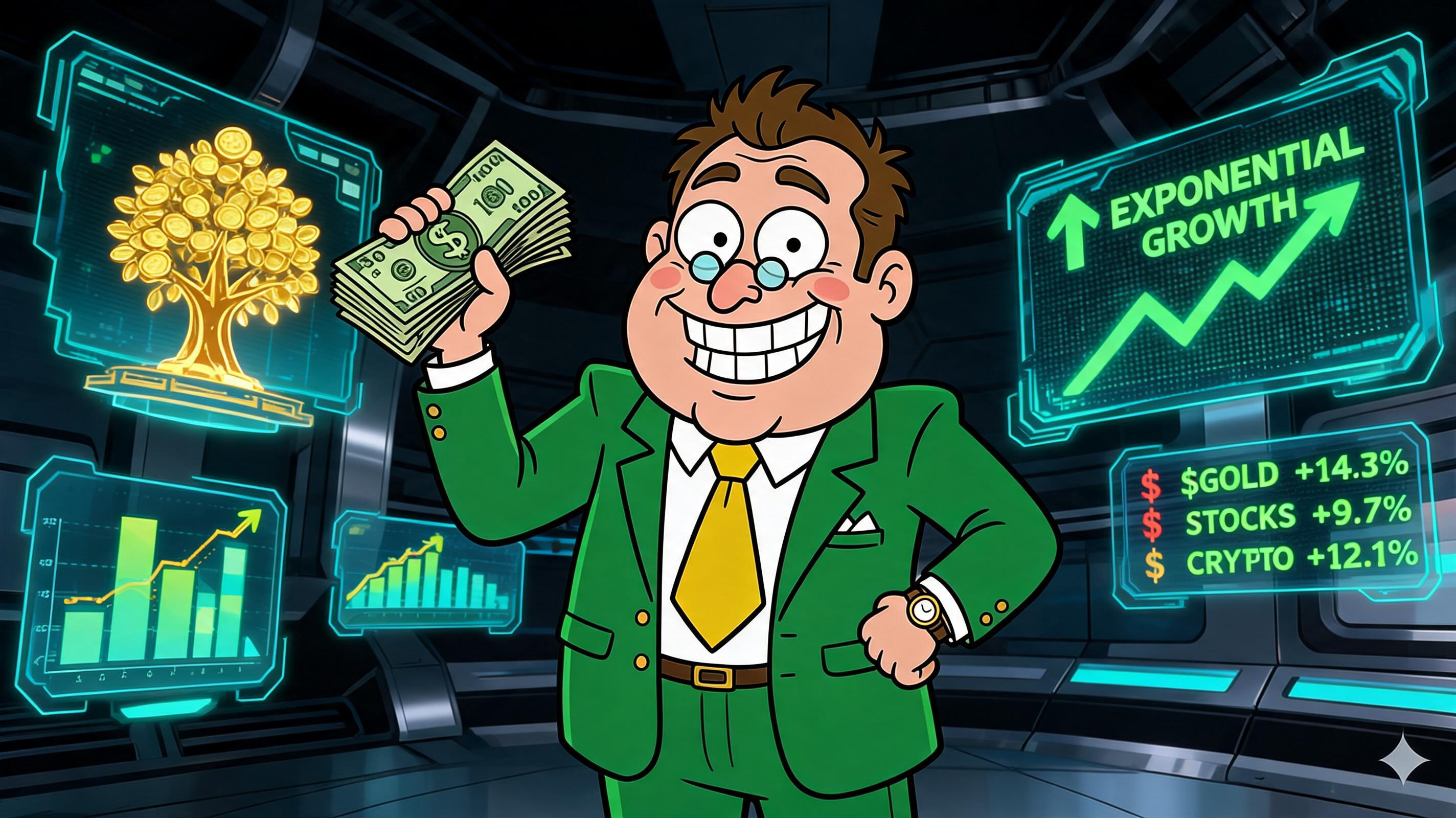 Art style: Family Guy style 2D animation, vibrant colors, caricature of a financial expert, clean vector lines, high contrast, 4K resolution, professional motion graphics.. A sprawling, futuristic command center with floating holographic screens displaying complex financial charts, glowing green stock tickers, and 3D models of golden trees. Nick stands in the center, gesturing energetically at a massive central hologram of a rising exponential curve. The room is constructed from polished obsidian and brushed chrome, illuminated by vibrant cyan and emerald light. The atmosphere is high-stakes and high-tech, with a sense of immense digital power. Wide-angle shot from a low perspective to make the scene feel epic and expansive. The color palette is dominated by deep blacks, neon greens, and brilliant golds. ━━━━━━━━━━━━━━━━━━━━━━━━━━━━━━━━━━━━━━ FINAL STYLE ENFORCEMENT (this is the authoritative rendering directive — it overrides any style wording elsewhere in the prompt): Render this image entirely in "Family Guy style 2D animation, vibrant colors, caricature of a financial expert, clean vector lines, high contrast, 4K resolution, professional motion graphics." style. Match the lighting grammar, material response, colour science, level of realism / stylisation, line weight, and shading model typical of "Family Guy style 2D animation, vibrant colors, caricature of a financial expert, clean vector lines, high contrast, 4K resolution, professional motion graphics.". Keep the subject, composition, camera angle, lighting direction, and colour palette from the description above — but EVERY surface, skin, fabric, material, and environmental element must be rendered in the "Family Guy style 2D animation, vibrant colors, caricature of a financial expert, clean vector lines, high contrast, 4K resolution, professional motion graphics." idiom, not in any other medium. Character appearance reference (MUST match exactly): - Nick: Мужчина средних лет плотного телосложения с круглым лицом, двойным подбородком и румяными щеками. У него короткие, слегка взъерошенные каштановые волосы и маленькие круглые очки на крупном носу. Он одет в ярко-зеленый пиджак с золотыми пуговицами, белую рубашку и широкий желтый галстук. На левом запястье видны золотые часы. Персонаж широко и восторженно улыбается, демонстрируя ровные белые зубы. Он стоит в уверенной позе, высоко подняв в одной руке веер из стодолларовых купюр, а другую руку положив на бедро.