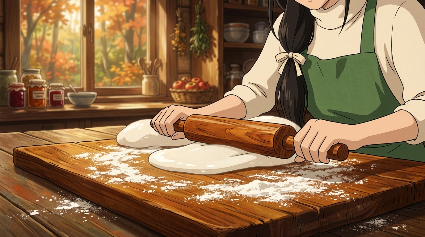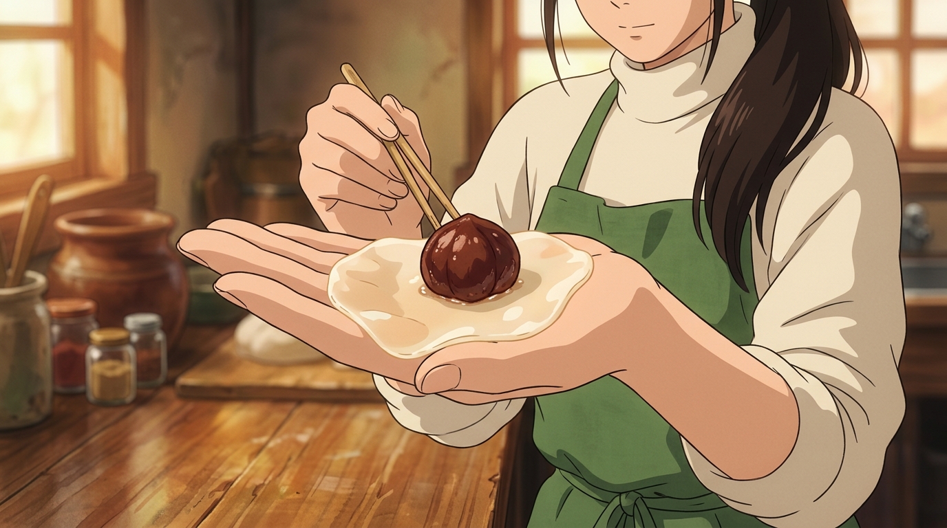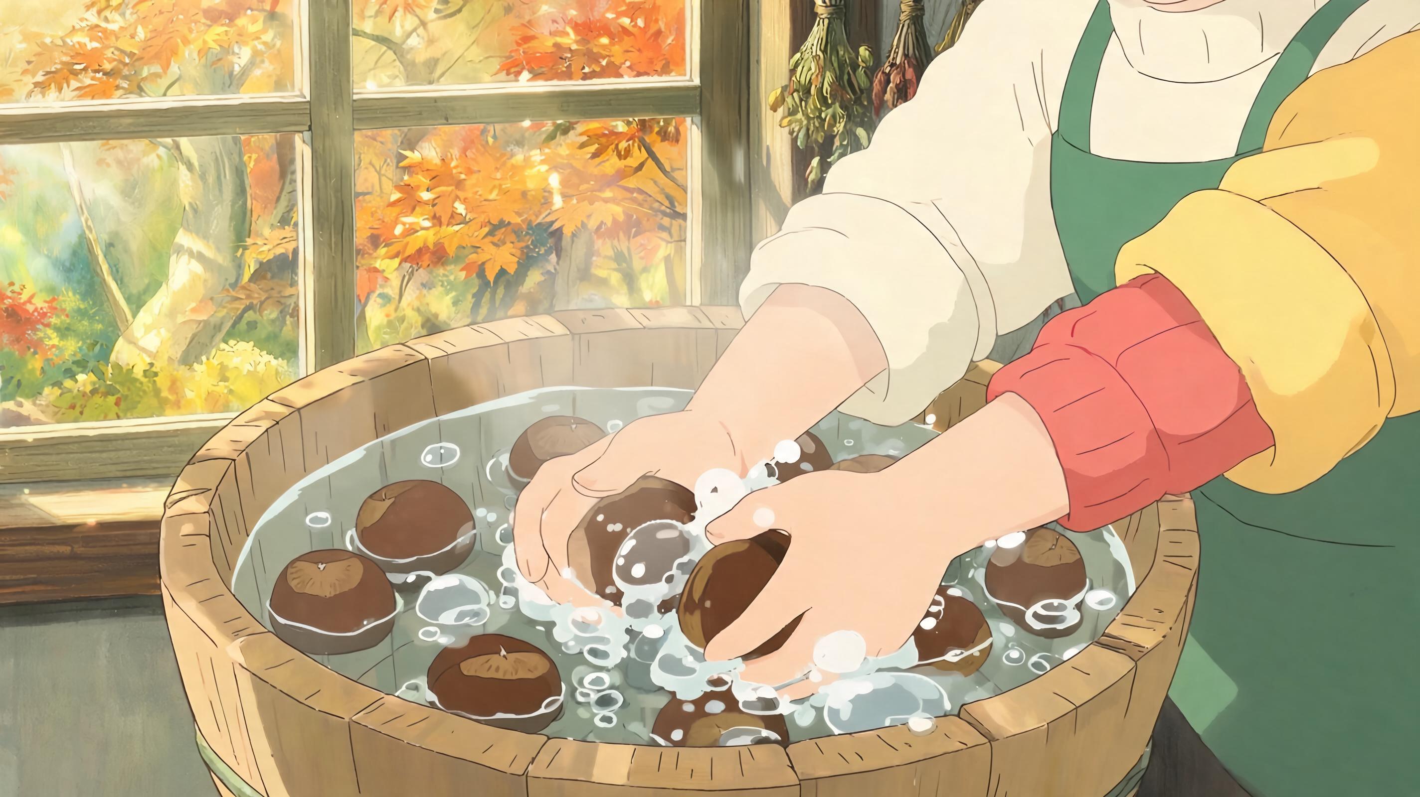 Art style: Studio Ghibli animation style, lush autumn forest, warm sunlight filtering through orange leaves, cozy wooden cottage, high detail, 4K, soft cinematic lighting.. Studio Ghibli style, extreme close-up of small child hands and larger hands washing chestnuts in a wooden bowl of clear, sparkling water, warm sunlight filtering through a kitchen window, soft bubbles, vibrant autumn aesthetic, high detail, 4K. ━━━━━━━━━━━━━━━━━━━━━━━━━━━━━━━━━━━━━━ FINAL STYLE ENFORCEMENT (this is the authoritative rendering directive — it overrides any style wording elsewhere in the prompt): Render this image entirely in "Studio Ghibli animation style, lush autumn forest, warm sunlight filtering through orange leaves, cozy wooden cottage, high detail, 4K, soft cinematic lighting." style. Match the lighting grammar, material response, colour science, level of realism / stylisation, line weight, and shading model typical of "Studio Ghibli animation style, lush autumn forest, warm sunlight filtering through orange leaves, cozy wooden cottage, high detail, 4K, soft cinematic lighting.". Keep the subject, composition, camera angle, lighting direction, and colour palette from the description above — but EVERY surface, skin, fabric, material, and environmental element must be rendered in the "Studio Ghibli animation style, lush autumn forest, warm sunlight filtering through orange leaves, cozy wooden cottage, high detail, 4K, soft cinematic lighting." idiom, not in any other medium. Character appearance reference (MUST match exactly): - Mei: A young girl named Mei, approximately 7 years old, with rosy, sun-kissed cheeks and large, expressive brown eyes full of wonder. She has short, dark hair styled in a messy bob with uneven bangs that bounce as she moves. Mei wears a vibrant yellow raincoat over a cozy red knitted sweater and sturdy brown leather boots. Her energy is infectious and playful. The background is a lush Studio Ghibli-inspired autumn forest with golden sunlight filtering through orange maple leaves. The art style is hand-drawn with soft textures and a warm, nostalgic glow, capturing a sense of childhood adventure and natural beauty. - Hana: Hana is a graceful young woman in her late teens with a calm and nurturing presence. She has long, straight dark hair tied back in a low, loose ponytail with a simple ribbon. Her face is oval with soft, kind features and a gentle smile. She wears a cream-colored turtleneck sweater under a forest-green linen apron and a long wool skirt. Standing in a cozy, rustic wooden kitchen filled with hanging dried herbs and jars of jam. The lighting is warm and cinematic, emphasizing a Studio Ghibli aesthetic with rich colors and detailed hand-painted backgrounds. She radiates a sense of peace and domestic comfort.