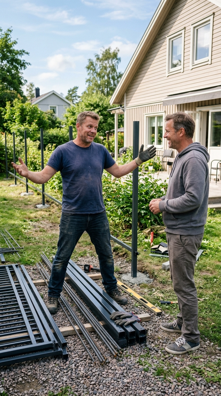 Art style: Realistic Photography. Мужчина (Сосед) стоит во дворе частного дома рядом с металлическими заготовками для забора. Он хвастливо жестикулирует, глядя на Клиента. Солнечный день, обстановка обыденная. ━━━━━━━━━━━━━━━━━━━━━━━━━━━━━━━━━━━━━━ FINAL STYLE ENFORCEMENT (this is the authoritative rendering directive — it overrides any style wording elsewhere in the prompt): Render this image entirely in "Realistic Photography" style. Match the lighting grammar, material response, colour science, level of realism / stylisation, line weight, and shading model typical of "Realistic Photography". Keep the subject, composition, camera angle, lighting direction, and colour palette from the description above — but EVERY surface, skin, fabric, material, and environmental element must be rendered in the "Realistic Photography" idiom, not in any other medium. Character appearance reference (MUST match exactly): - Сосед: Strong rule: style --- Realistic Photography ---. Мужчина 45-50 лет, в повседневной одежде (джинсы и футболка), с легкой небритостью. Выглядит самоуверенно и немного хвастливо. - Клиент: Мужчина или женщина 40-50 лет, одет(а) в обычную домашнюю одежду. Выражение лица меняется от разочарования к искренней радости.