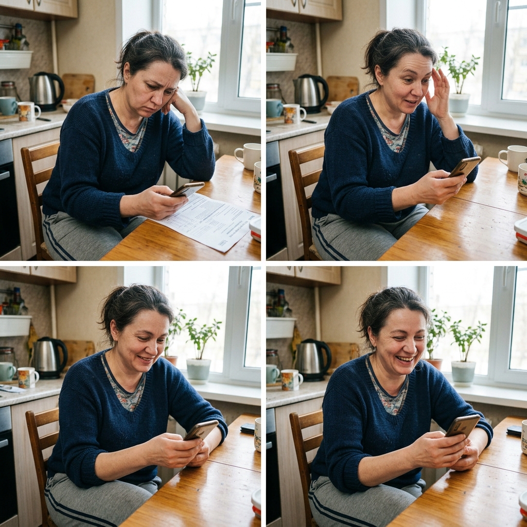 Strong rule: style --- Realistic Photography ---. Мужчина или женщина 40-50 лет, одет(а) в обычную домашнюю одежду. Выражение лица меняется от разочарования к искренней радости.