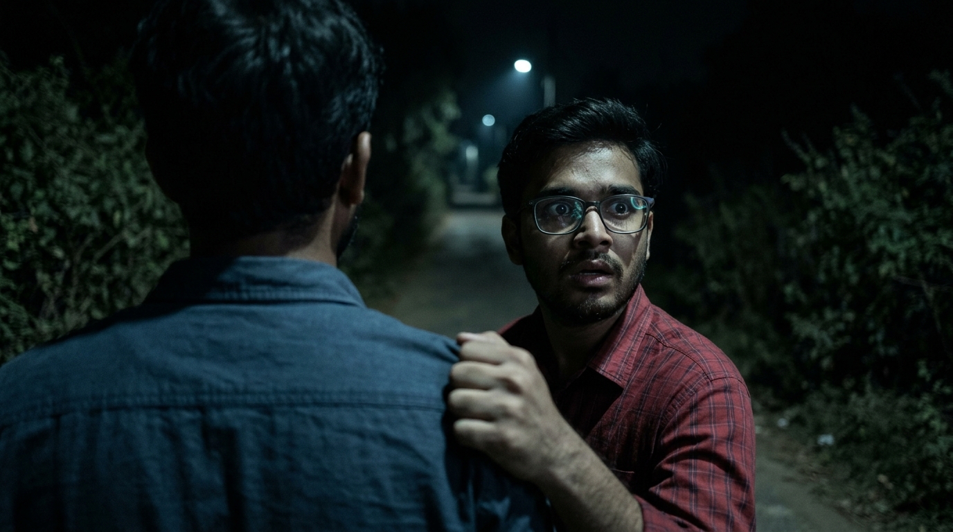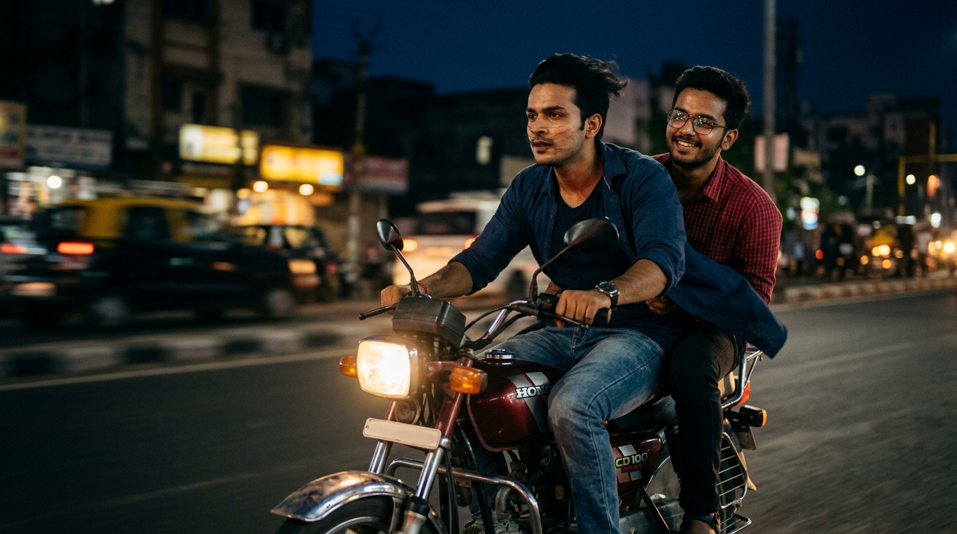 Art style: Cinematic Realistic. बाइक पर बैठे तीनों का एक साइड प्रोफाइल शॉट। बच्चा अब राहुल और अमित के बीच में बैठा है। बच्चे का चेहरा पीला और निर्जीव लग रहा है। अमित बहुत ही असहज दिख रहा है और बच्चे से दूर हटने की कोशिश कर रहा है। राहुल बाइक चला रहा है लेकिन उसके चेहरे पर अब चिंता के भाव हैं। रात का अंधेरा उनके चारों ओर एक दीवार की तरह खड़ा है। रंग पैलेट में ठंडे ग्रे और गहरे हरे रंग शामिल हैं। ━━━━━━━━━━━━━━━━━━━━━━━━━━━━━━━━━━━━━━ FINAL STYLE ENFORCEMENT (this is the authoritative rendering directive — it overrides any style wording elsewhere in the prompt): Render this image entirely in "Cinematic Realistic" style. Match the lighting grammar, material response, colour science, level of realism / stylisation, line weight, and shading model typical of "Cinematic Realistic". Keep the subject, composition, camera angle, lighting direction, and colour palette from the description above — but EVERY surface, skin, fabric, material, and environmental element must be rendered in the "Cinematic Realistic" idiom, not in any other medium. Character appearance reference (MUST match exactly): - राहुल: एक 22 वर्षीय भारतीय युवक, मध्यम कद-काठी, छोटे काले बाल, और क्लीन-शेव चेहरा। उसने एक गहरे नीले रंग की कैजुअल शर्ट और जींस पहनी हुई है। उसकी आंखों में आत्मविश्वास है, लेकिन बाद में वे डर से चौड़ी हो जाती हैं। वह एक आधुनिक शहरी युवक की तरह दिखता है। बैकग्राउंड में रात का धुंधला शहर है। चित्रण में यथार्थवादी शारीरिक विशेषताएं और चेहरे के भाव स्पष्ट हैं। प्रकाश व्यवस्था चेहरे पर एक तरफ से पड़ रही है, जिससे चेहरे के भावों में गहराई आती है। - अमित: एक 22 वर्षीय भारतीय युवक, जिसने चश्मा पहना हुआ है और उसकी दाढ़ी हल्की बढ़ी हुई है। उसने एक लाल रंग की चेकर्ड शर्ट पहनी है। उसके चेहरे पर हमेशा थोड़ी चिंता और सतर्कता के भाव रहते हैं। उसकी बनावट दुबली-पतली है। वह अपनी बाइक की पिछली सीट पर बैठा हुआ दिखता है। रात की पीली स्ट्रीट लाइट उसके चश्मे पर चमक पैदा कर रही है। उसकी नजरें हमेशा आसपास के अंधेरे को टटोलती रहती हैं। - बच्चा: लगभग 7 साल का एक छोटा लड़का, जिसका चेहरा बहुत ही शांत लेकिन डरावना है। उसने फटे-पुराने और गंदे सफेद कपड़े पहने हुए हैं। उसके बाल बिखरे हुए हैं और त्वचा बहुत पीली है। उसकी सबसे डरावनी विशेषता उसकी पूरी तरह से काली आंखें हैं जिनमें कोई पुतली नहीं है। उसके पैर टखनों से पूरी तरह पीछे की ओर मुड़े हुए हैं। वह रात के अंधेरे में एक पेड़ के नीचे खड़ा है, जहाँ छाया और रोशनी का खेल उसे और भी भयानक बनाता है।
