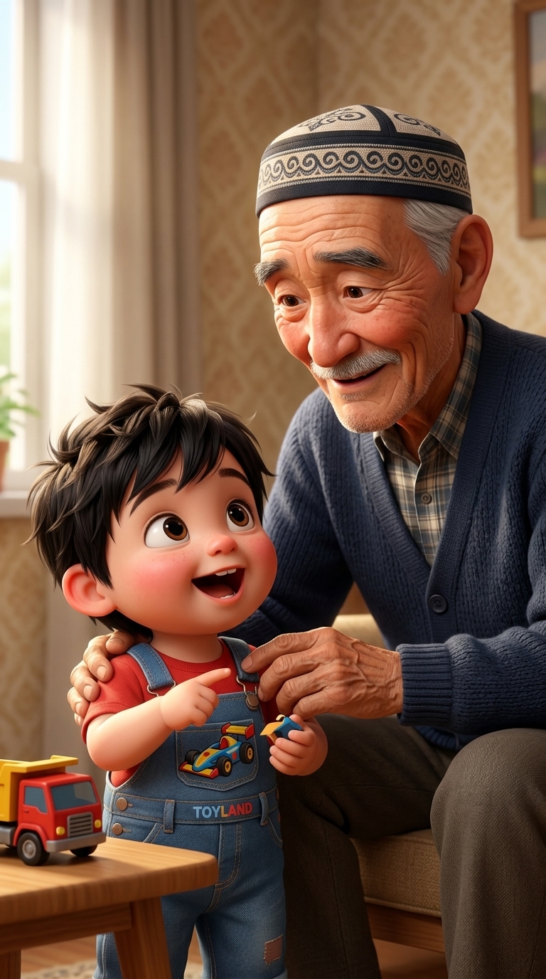 Art style: 3D Pixar. Они останавливаются у невысокого ограждения стройплощадки. На заднем плане виден большой грузовой автобетононасос с длинной, сложенной стрелой. Внук с удивлением и восторгом смотрит на него, широко открыв глаза. ━━━━━━━━━━━━━━━━━━━━━━━━━━━━━━━━━━━━━━ FINAL STYLE ENFORCEMENT (this is the authoritative rendering directive — it overrides any style wording elsewhere in the prompt): Render this image entirely in "3D Pixar" style. Match the lighting grammar, material response, colour science, level of realism / stylisation, line weight, and shading model typical of "3D Pixar". Keep the subject, composition, camera angle, lighting direction, and colour palette from the description above — but EVERY surface, skin, fabric, material, and environmental element must be rendered in the "3D Pixar" idiom, not in any other medium. Character appearance reference (MUST match exactly): - Дедушка: Пожилой мужчина, около 70 лет, с добрыми морщинками вокруг глаз, седые волосы и усы. Одет в уютный кардиган, рубашку и классические брюки. На лице теплая, любящая улыбка. Стиль 3D-анимации Pixar. - Внук: Мальчик, 5-6 лет, с большими любопытными глазами и взъерошенными светлыми волосами. Одет в яркую футболку с рисунком машинки и джинсовый комбинезон. Восторженное и счастливое выражение лица. Стиль 3D-анимации Pixar. Reference images context (match the visual style and elements from these): - Про дедушка и внук (character): Пожилой мужчина с усами в синем кардигане и традиционной тюбетейке держит на руках малыша в сером костюме на фоне светлых узорчатых обоев. Портрет выполнен в спокойных тонах и передает атмосферу семейной преемственности и культурных традиций.